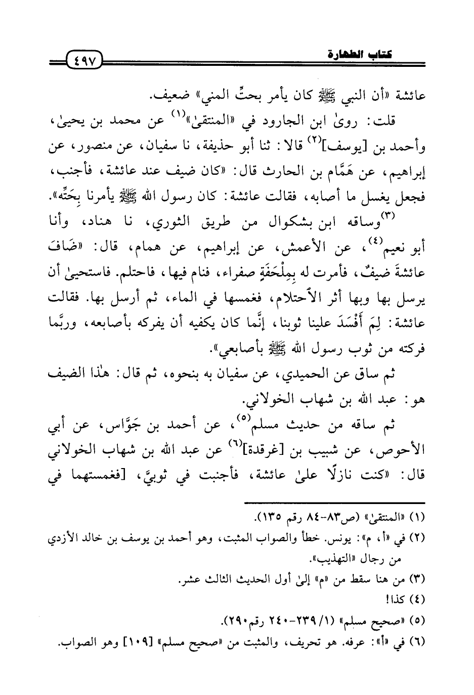 ثمَّ سَاقه من حَدِيث مُسلم، عَن أَحْمد بن جَوَّاس، عَن أبي الْأَحْوَص، عَن شبيب بن [غرقدة] عَن عبد الله بن شهَاب الْخَولَانِيّ قَالَ: «كنت نازلاً عَلَى عَائِشَة، فأجنبت فِي ثوبيَّ، [فغمستهما فِي