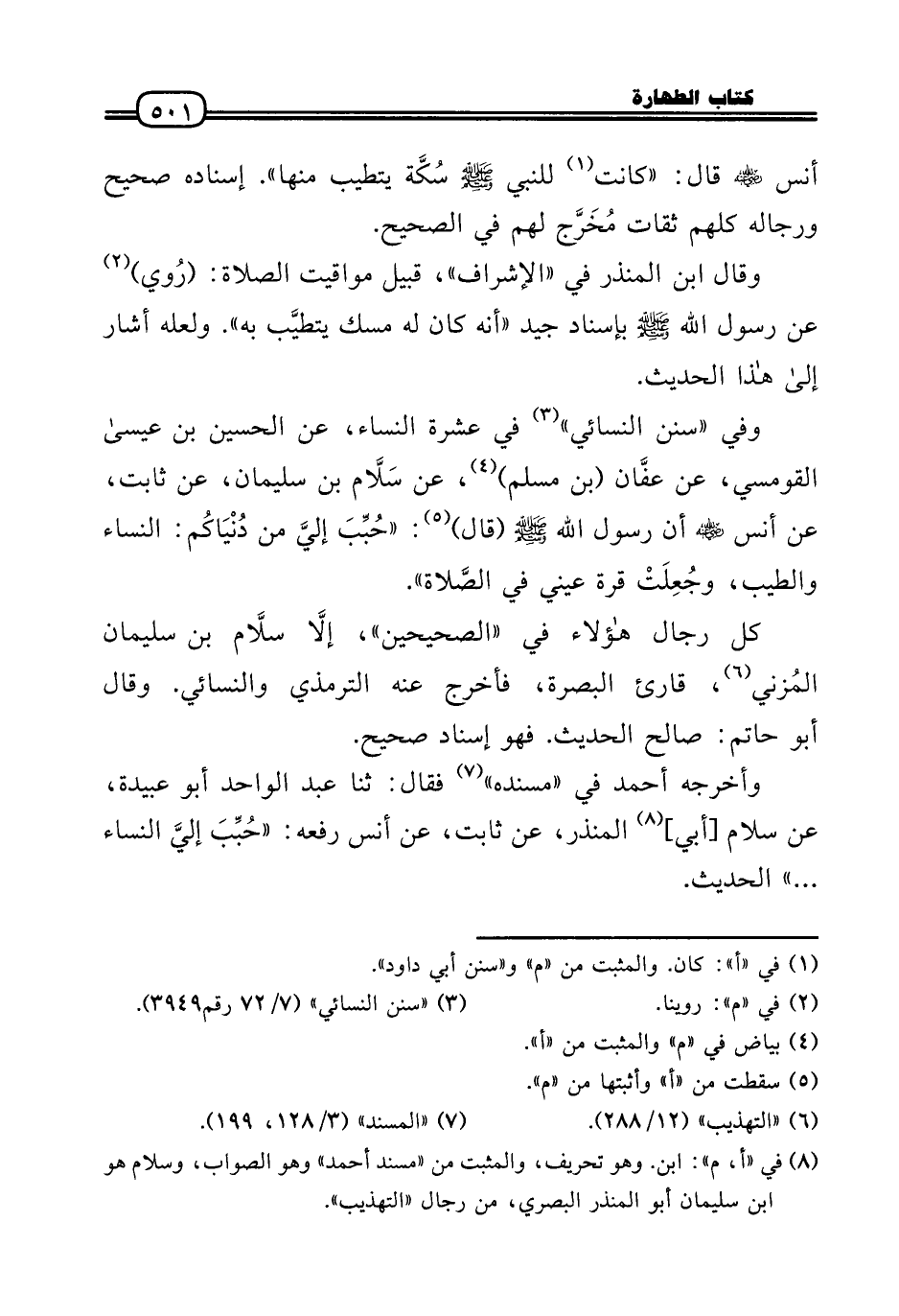 وَفِي «سنَن النَّسَائِيّ» فِي عشرَة النِّسَاء، عَن الْحُسَيْن بن عِيسَى القومسي، عَن عفَّان (بن مُسلم) ، عَن سَلاَّم بن سُلَيْمَان، عَن ثَابت، عَن أنس رَضِي اللهُ عَنْهُ أَن رَسُول الله - صَلَّى الله عَلَيْهِ وَسلم - (قَالَ) : «حُبِّبَ إليَّ من دُنْيَاكُم: النِّسَاء وَالطّيب، وجُعِلَتْ قُرَّة عَيْني فِي الصَّلاة» .