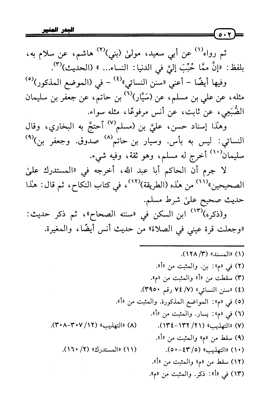 ثمَّ رَوَاهُ عَن أبي سعيد، مولَى (بني) هَاشم، عَن سَلام بِهِ، بِلَفْظ: «إنَّ ممَّا حُبِّبَ إليَّ فِي الدُّنْيَا: النِّسَاء ... » (الحَدِيث) .