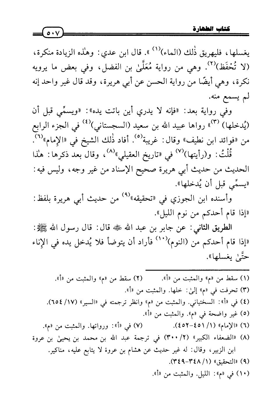 يغسلهَا، فليهريق ذَلِك (المَاء) » . قَالَ ابْن عدي: وَهَذِه الزِّيَادَة مُنكرَة، (لَا تُحْفَظ) . وَهِي من رِوَايَة مُعَلَّى بن الْفضل، وَفِي بعض مَا يرويهِ نكرَة، وَهِي أَيْضا من رِوَايَة الْحسن عَن أبي هُرَيْرَة، وَقد قَالَ غير وَاحِد إِنَّه لم يسمع مِنْهُ.