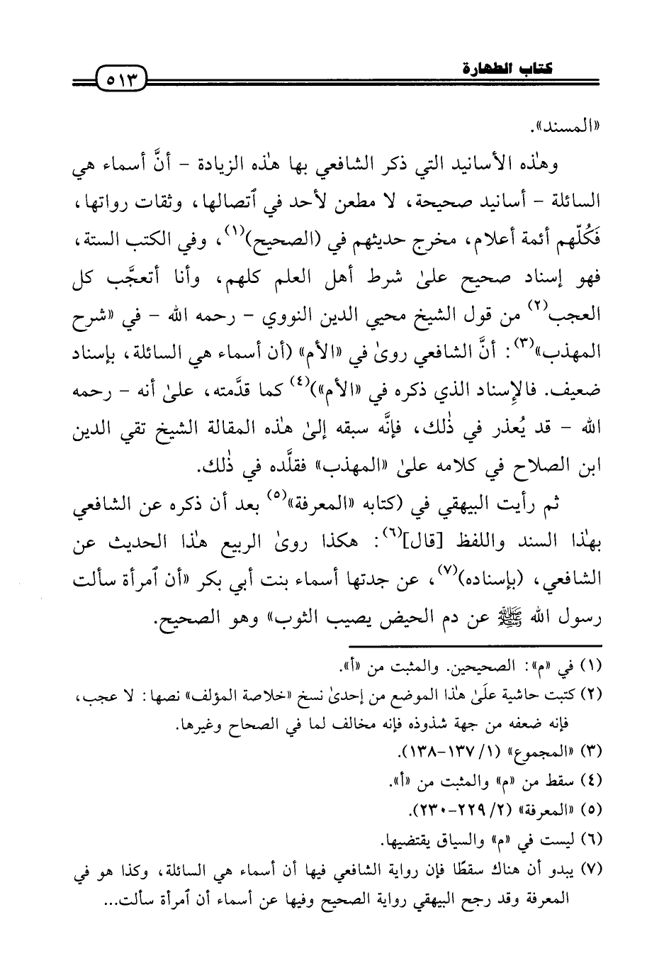 وَهَذِه الْأَسَانِيد الَّتِي ذكر الشَّافِعِي بهَا هَذِه الزِّيَادَة - أنَّ أَسمَاء هِيَ السائلة - أَسَانِيد صَحِيحَة، لَا مطْعن لأحد فِي اتصالها، وثقات رواتها، فَكُلّهم أَئِمَّة أَعْلَام، مخرج حَدِيثهمْ فِي (الصَّحِيح) ، وَفِي الْكتب السِّتَّة، فَهُوَ إِسْنَاد صَحِيح عَلَى شَرط أهل الْعلم كلهم، وَأَنا أتعجَّب كل الْعجب من قَول الشَّيْخ محيي الدَّين النَّوَوِيّ - رَحِمَهُ اللَّهُ - فِي «شرح الْمُهَذّب» : أنَّ الشَّافِعِي رَوَى فِي «الْأُم» (أَن أَسمَاء هِيَ السائلة، بِإِسْنَاد ضَعِيف. فالإِسناد الَّذِي ذكره فِي «الْأُم» ) كَمَا قدَّمته، عَلَى أَنه - رَحِمَهُ اللَّهُ - قد يُعذر فِي ذَلِك، فإنَّه سبقه إِلَى هَذِه الْمقَالة الشَّيْخ تَقِيّ الدَّين ابْن الصّلاح فِي كَلَامه عَلَى (الْمُهَذّب» فقلَّده فِي ذَلِك.