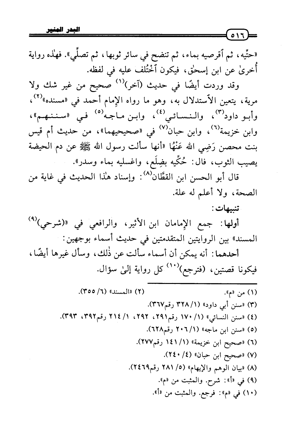 وَقد وَردت أَيْضا فِي حَدِيث (آخر) صَحِيح من غير شكّ وَلَا مرية، يتَعَيَّن الِاسْتِدْلَال بِهِ، وَهُوَ مَا رَوَاهُ الإِمام أَحْمد فِي «مُسْنده» ، وَأَبُو دَاوُد، وَالنَّسَائِيّ، وَابْن مَاجَه فِي «سُنَنهمْ» ، وَابْن خُزَيْمَة، وَابْن حبَان فِي «صَحِيحَيْهِمَا» ، من حَدِيث أم قيس بنت مُحصن رَضِي اللهُ عَنْهُا «أَنَّهَا سَأَلت رَسُول الله - صَلَّى الله عَلَيْهِ وَسلم - عَن دم الْحَيْضَة يُصِيب الثَّوْب، فال: حُكِّيه بضِلَع، واغسليه بِمَاء وَسدر» .