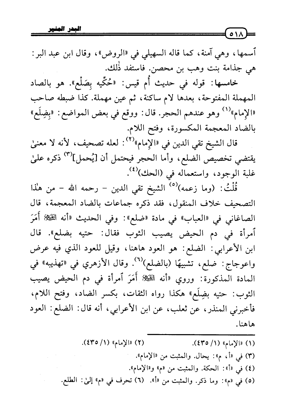 قُلْتُ: (وَمَا زَعمه) الشَّيْخ تَقِيّ الدَّين - رَحِمَهُ اللَّهُ - من هَذَا التَّصْحِيف خلاف الْمَنْقُول، فقد ذكره جماعات بالضاد الْمُعْجَمَة، قَالَ الصَّاغَانِي فِي «الْعباب» فِي مَادَّة «ضلع» : وَفِي الحَدِيث «أَنه عَلَيْهِ السَّلَام أَمَرَ امْرَأَة فِي دم الْحيض يُصِيب الثَّوْب فَقَالَ: حتيه بضلع» . قَالَ ابْن الْأَعرَابِي: الضلع: هُوَ الْعود هَاهُنَا، وَقيل للعود الَّذِي فِيهِ عرض واعوجاج: ضلع، تَشْبِيها (بالضلع) . وَقَالَ الْأَزْهَرِي فِي «تهذيبه» فِي الْمَادَّة الْمَذْكُورَة: وَرُوِيَ «أَنه عَلَيْهِ السَّلَام أَمَرَ امْرَأَة فِي دم الْحيض يُصِيب الثَّوْب: حتيه بضِلَع» هَكَذَا رَوَاهُ الثِّقَات، بِكَسْر الضَّاد، وَفتح اللَّام، فَأَخْبرنِي الْمُنْذر، عَن ثَعْلَب، عَن ابْن الْأَعرَابِي، أَنه قَالَ: الضلع: الْعود هَاهُنَا.