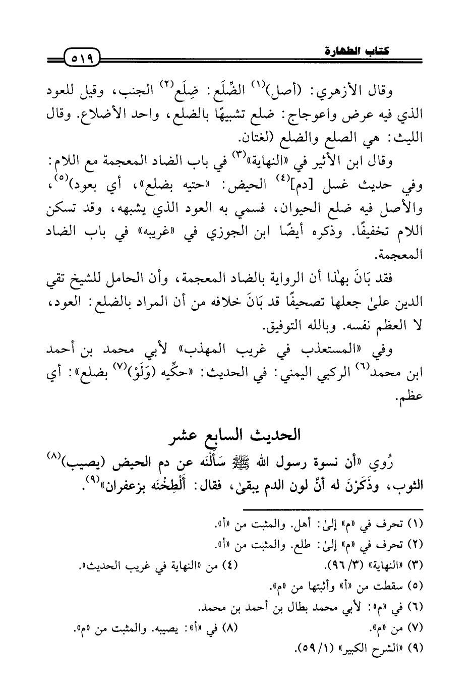وَقَالَ ابْن الْأَثِير فِي «النِّهَايَة» فِي بَاب الضَّاد الْمُعْجَمَة مَعَ اللَّام: وَفِي حَدِيث غسل [دم] الْحيض: «حتيه بضلع» ، أَي بِعُود) ، وَالْأَصْل فِيهِ ضلع الْحَيَوَان، فَسُمي بِهِ الْعود الَّذِي يُشبههُ، وَقد تسكن اللَّام تَخْفِيفًا. وَذكره أَيْضا ابْن الْجَوْزِيّ فِي «غَرِيبه» فِي بَاب الضَّاد الْمُعْجَمَة.