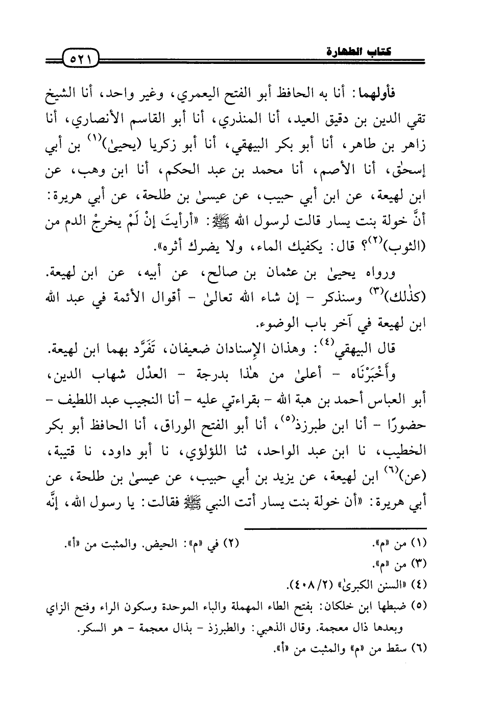 فأولهما: أَنا بِهِ الْحَافِظ أَبُو الْفَتْح الْيَعْمرِي، وَغير وَاحِد، أَنا الشَّيْخ تَقِيّ الدَّين بن دَقِيق الْعِيد، أَنا الْمُنْذِرِيّ، أَنا أَبُو الْقَاسِم الْأنْصَارِيّ، أَنا زَاهِر بن طَاهِر، أَنا أَبُو بكر الْبَيْهَقِيّ، أَنا أَبُو زَكَرِيَّا (يَحْيَى) بن أبي إِسْحَاق، أَنا الْأَصَم، أَنا مُحَمَّد بن عبد الحكم، أَنا ابْن وهب، عَن ابْن لَهِيعَة، عَن ابْن أبي حبيب، عَن عِيسَى بن طَلْحَة، عَن أبي هُرَيْرَة: أنَّ خَوْلَة بنت يسَار قَالَت لرَسُول الله - صَلَّى الله عَلَيْهِ وَسلم -: «أرأيتَ إنْ لَمْ يخرجْ الدَّم من (الثَّوْب) ؟ قَالَ: يَكْفِيك المَاء، وَلَا يَضرك أَثَره» .