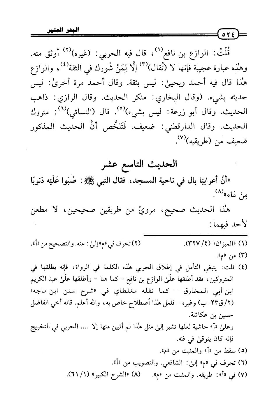 قُلْتُ: الْوَازِع بن نَافِع، قَالَ فِيهِ الْحَرْبِيّ: (غَيره) أوثق مِنْهُ. وَهَذِه عبارَة عَجِيبَة فَإِنَّهَا لَا (تُقال) إلاَّ لِمَنْ شُورك فِي الثِّقَة، والوازع هَذَا قَالَ فِيهِ أَحْمد وَيَحْيَى: لَيْسَ بِثِقَة. وَقَالَ أَحْمد مرّة أُخْرَى: لَيْسَ حَدِيثه بِشَيْء. (وَقَالَ البُخَارِيّ: مُنكر الحَدِيث. وَقَالَ الرَّازِيّ: ذَاهِب الحَدِيث. وَقَالَ أَبُو زرْعَة: لَيْسَ بِشَيْء) . قَالَ (النَّسَائِيّ) : مَتْرُوك الحَدِيث. وَقَالَ الدَّارَقُطْنِيّ: ضَعِيف. فَتَلخَّص أنَّ الحَدِيث الْمَذْكُور ضَعِيف من (طريقيه) .