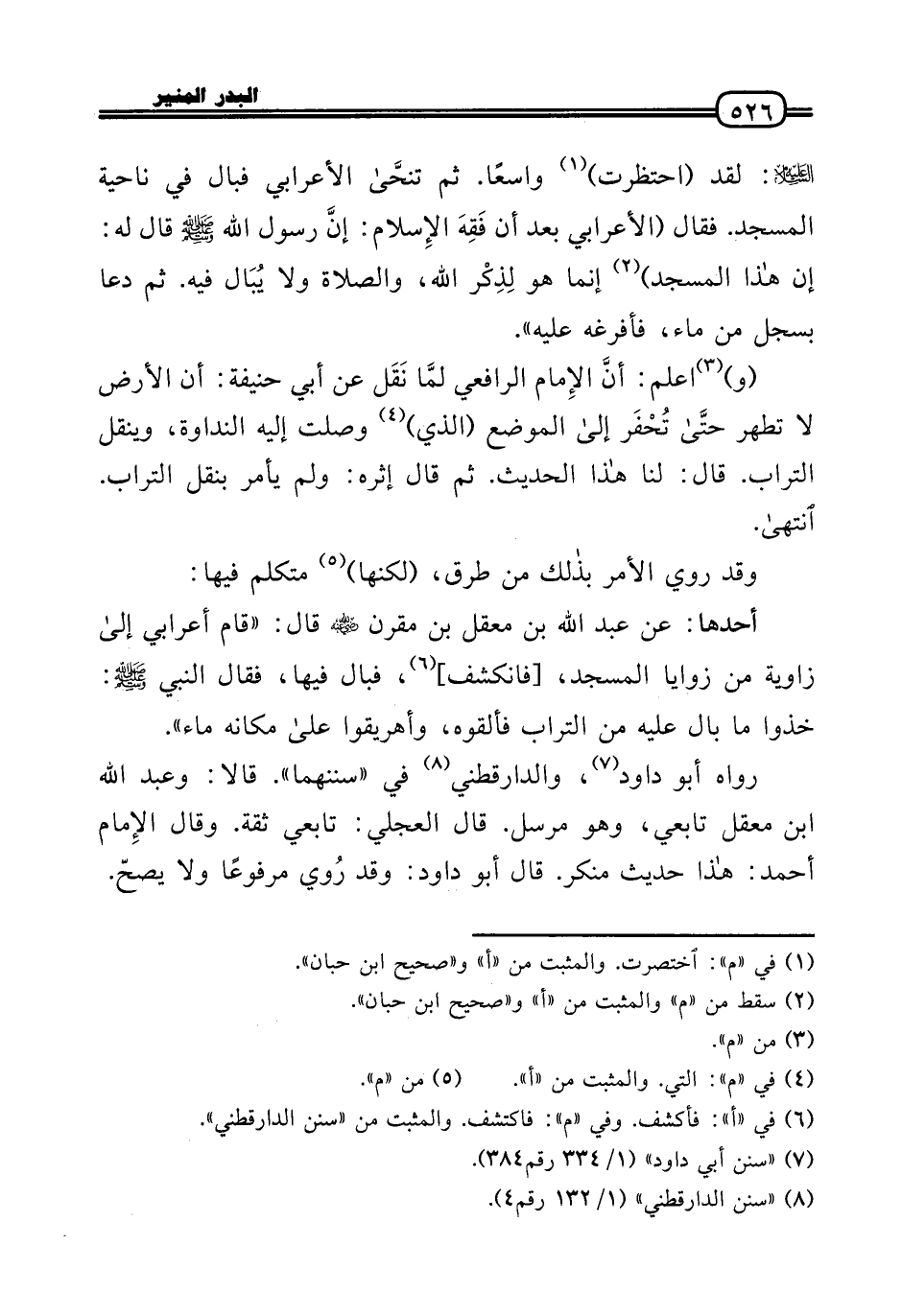 عَلَيْهِ السَّلَام: لقد (احتظرت) وَاسِعًا. ثمَّ تنحَّى الْأَعرَابِي فَبَال فِي نَاحيَة الْمَسْجِد. فَقَالَ (الْأَعرَابِي بعد أَن فَقِهَ الإِسلام: إنَّ رَسُول الله - صَلَّى الله عَلَيْهِ وَسلم - قَالَ لَهُ: إِن هَذَا الْمَسْجِد) إِنَّمَا هُوَ لِذِكْر الله، وَالصَّلَاة وَلَا يُبَال فِيهِ. ثمَّ دَعَا بسجل من مَاء، فأفرغه عَلَيْهِ» .