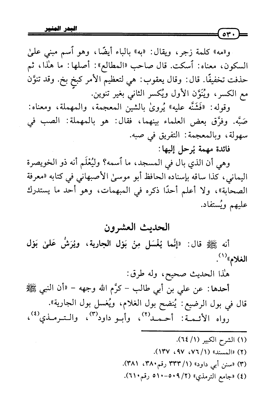 أَحدهَا: عَن عَلّي بن أبي طَالب - كرَّم الله وَجهه - «أَن النَّبِي - صَلَّى الله عَلَيْهِ وَسلم - قَالَ فِي بَوْل الرَّضِيع: يُنضح بَوْل الْغُلَام، ويُغسل بَوْل الْجَارِيَة» .