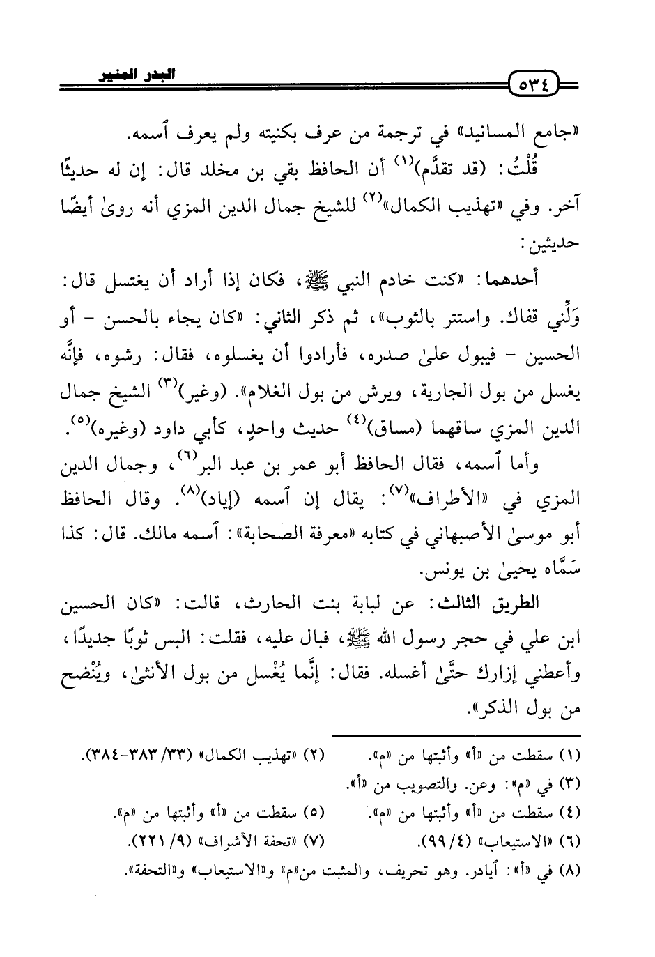الطَّرِيق الثَّالِث: عَن لبَابَة بنت الْحَارِث، قَالَت: «كَانَ الْحُسَيْن بن عَلّي فِي حجر رَسُول الله - صَلَّى الله عَلَيْهِ وَسلم -، فَبَال عَلَيْهِ، فَقلت: البس ثوبا جَدِيدا، وَأَعْطِنِي إزارك حتَّى أغسله. فَقَالَ: إنَّما يُغْسل من بَوْل الْأُنْثَى، ويُنْضح من بَوْل الذّكر» .