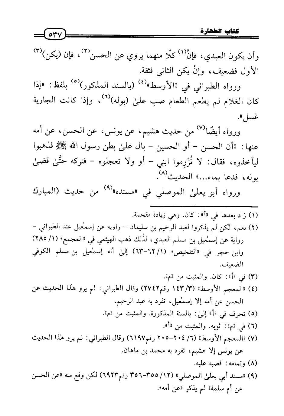 وَرَوَاهُ أَيْضا من حَدِيث هشيم، عَن يُونُس، عَن الْحسن، عَن أمه عَنْهَا: «أَن الْحسن - أَو الْحُسَيْن - بَال عَلَى بطن رَسُول الله - صَلَّى الله عَلَيْهِ وَسلم - فَذَهَبُوا ليأخذوه، فَقَالَ: لَا تُزْرِموا ابْني - أَو وَلَا تعجلوه - فَتَركه حتَّى قَضَى بَوْله، فَدَعَا بِمَاء ... » الحَدِيث.