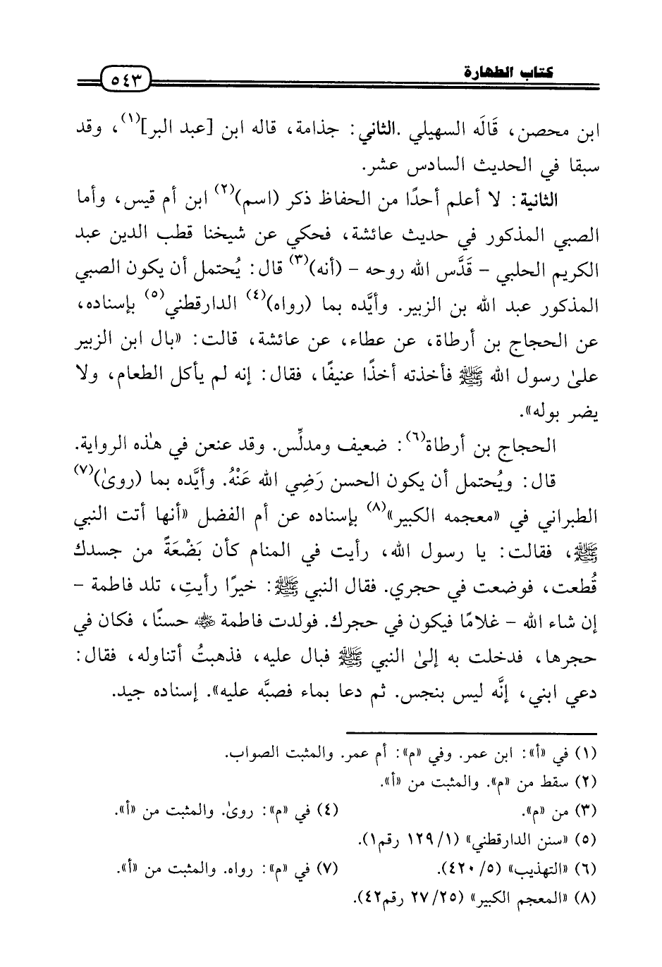 الثَّانِيَة: لَا أعلم أحدا من الْحفاظ ذكر (اسْم) ابْن أم قيس، وَأما الصَّبِي الْمَذْكُور فِي حَدِيث عَائِشَة، فحكي عَن شَيخنَا قطب الدَّين عبد الْكَرِيم الْحلَبِي - قَدَّس الله روحه - (أَنه) قَالَ: يُحتمل أَن يكون الصَّبِي الْمَذْكُور عبد الله بن الزبير. وأيَّده بِمَا (رَوَاهُ) الدَّارَقُطْنِيّ بِإِسْنَادِهِ، عَن الْحجَّاج بن أَرْطَاة، عَن عَطاء، عَن عَائِشَة، قَالَت: «بَال ابْن الزبير عَلَى رَسُول الله - صَلَّى الله عَلَيْهِ وَسلم - فَأَخَذته أخذا عنيفًا، فَقَالَ: إِنَّه لم يَأْكُل الطَّعَام، وَلَا يضر بَوْله» .