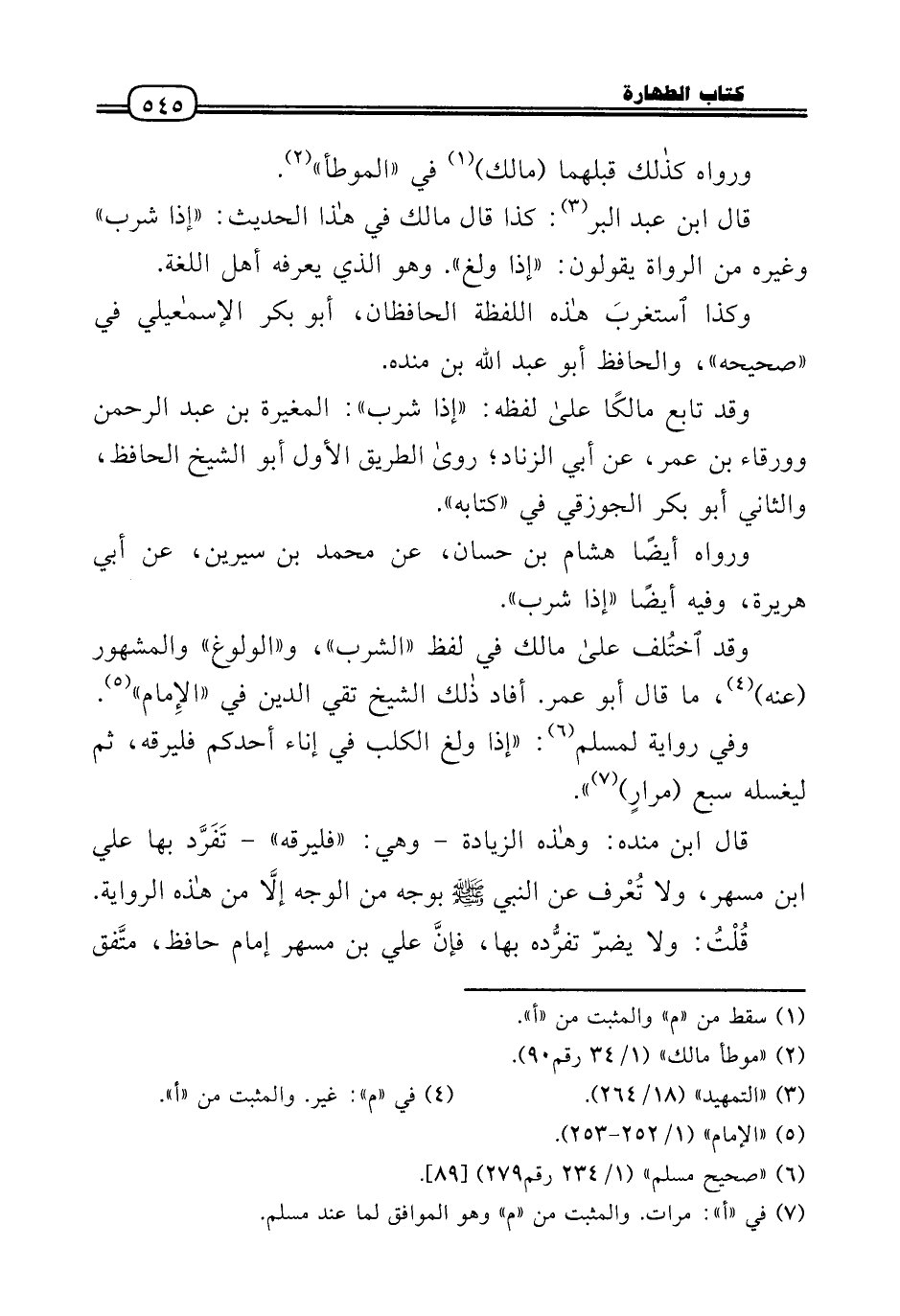 وَقد اختُلف عَلَى مَالك فِي لفظ «الشّرْب» ، و «الولوغ» وَالْمَشْهُور (عَنهُ) ، مَا قَالَ أَبُو عمر. أَفَادَ ذَلِك الشَّيْخ تَقِيّ الدَّين فِي «الإِمام» .
