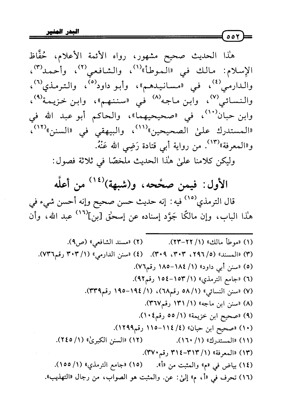 هَذَا الحَدِيث صَحِيح مَشْهُور، رَوَاهُ الْأَئِمَّة الْأَعْلَام، حُفَّاظ الإِسلام: مَالك فِي «الْمُوَطَّأ» ، وَالشَّافِعِيّ، وَأحمد، والدارمي، فِي «مسانيدهم» ، وَأَبُو دَاوُد، وَالتِّرْمِذِيّ، وَالنَّسَائِيّ، وَابْن مَاجَه فِي «سُنَنهمْ» ، وَابْن خُزَيْمَة، وَابْن حبَان، فِي «صَحِيحَيْهِمَا» ، وَالْحَاكِم أَبُو عبد الله فِي «الْمُسْتَدْرك عَلَى الصَّحِيحَيْنِ» ، وَالْبَيْهَقِيّ فِي «السّنَن» ، و «الْمعرفَة» . من رِوَايَة أبي قَتَادَة رَضِي اللهُ عَنْهُ.