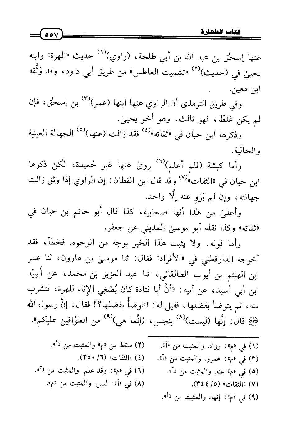 وَأما قَوْله: وَلَا يثبت هَذَا الْخَبَر بِوَجْه من الْوُجُوه. فخطأ، فقد أخرجه الدَّارَقُطْنِيّ فِي «الْأَفْرَاد» فَقَالَ: ثَنَا مُوسَى بن هَارُون، ثَنَا عمر بن الْهَيْثَم بن أَيُّوب الطَّالقَانِي، ثَنَا عبد الْعَزِيز بن مُحَمَّد، عَن أَسِيْد بن أبي أسيد، عَن أَبِيه: «أنَّ أَبَا قَتَادَة كَانَ يُصْغِي الإِناء للهرة، فَتَشرب مِنْهُ، ثمَّ يتَوَضَّأ بفضلها، فَقيل لَهُ: أتتوضأُ بفضلها؟ ! فَقَالَ: إنَّ رَسُول الله - صَلَّى الله عَلَيْهِ وَسلم - قَالَ: إنَّها (لَيست) بِنَجس، (إنَّما هِيَ) من الطوَّافين عَلَيْكُم» .