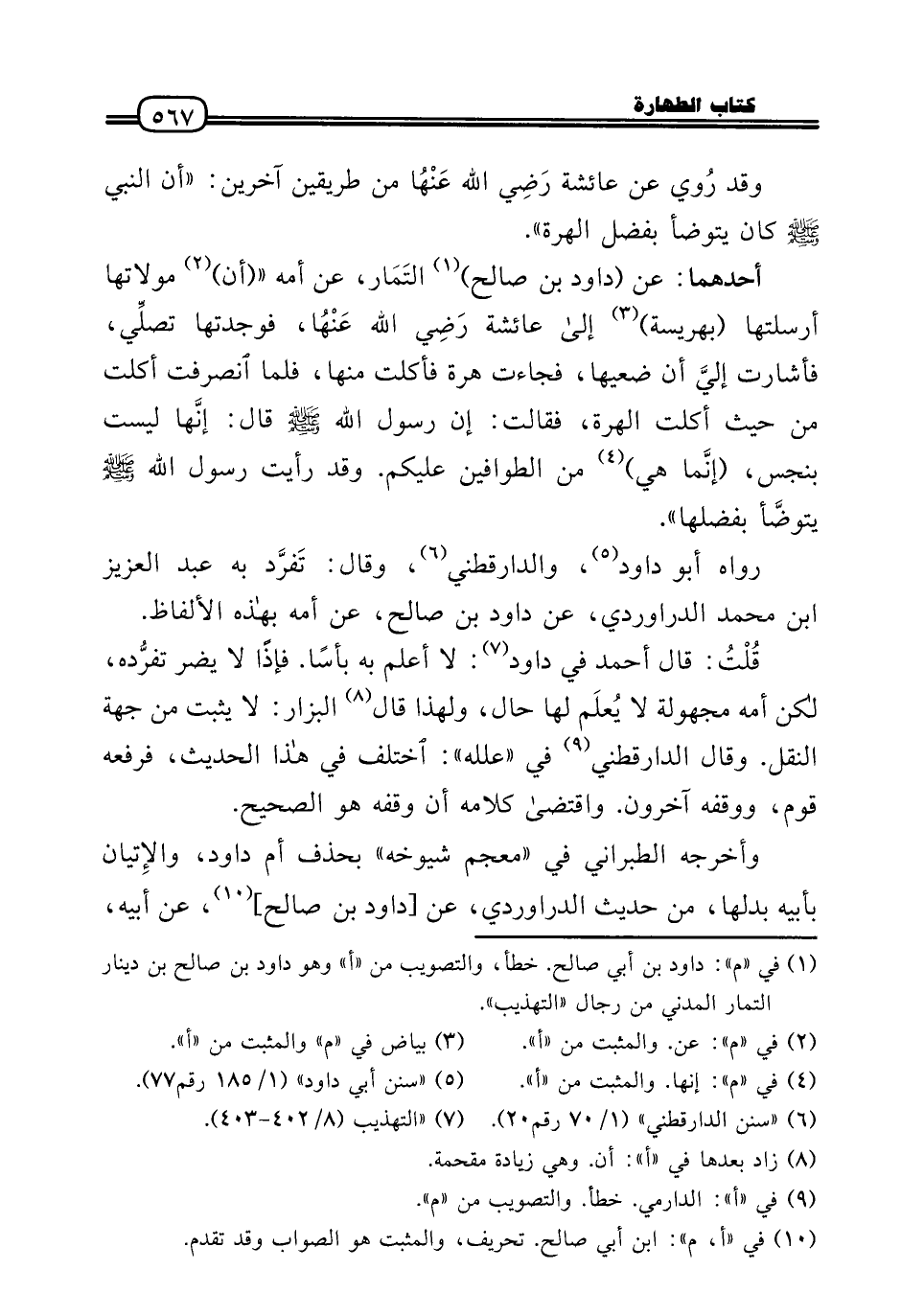 أَحدهمَا: عَن (دَاوُد بن صَالح) التَمَار، عَن أمه « (أَن) مولاتها أرسلتها (بهريسة) إِلَى عَائِشَة رَضِي اللهُ عَنْهُا، فَوَجَدتهَا تصلِّي، فَأَشَارَتْ إليَّ أَن ضعيها، فَجَاءَت هرة فَأكلت مِنْهَا، فَلَمَّا انصرفت أكلت من حَيْثُ أكلت الْهِرَّة، فَقَالَت: إِن رَسُول الله - صَلَّى الله عَلَيْهِ وَسلم - قَالَ: إنَّها لَيست بِنَجس، (إنَّما هِيَ) من الطوافين عَلَيْكُم. وَقد رَأَيْت رَسُول الله - صَلَّى الله عَلَيْهِ وَسلم - يتوضَّأ بفضلها» .