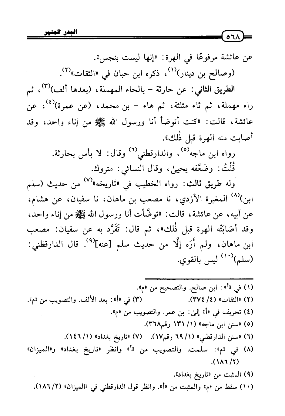 وَله طَرِيق ثَالِث: رَوَاهُ الْخَطِيب فِي «تَارِيخه» من حَدِيث (سلم بن) الْمُغيرَة الْأَزْدِيّ، نَا مُصعب بن ماهان، نَا سُفْيَان، عَن هِشَام، عَن أَبِيه، عَن عَائِشَة، قَالَت: «توضَّأت أَنا وَرَسُول الله - صَلَّى الله عَلَيْهِ وَسلم - من إِنَاء وَاحِد، وَقد أصَابَتْه الْهِرَّة قبل ذَلِك» ، ثمَّ قَالَ: تَفَرَّد بِهِ عَن سُفْيَان: مُصعب بن ماهان، وَلم أَرَه إلاَّ من حَدِيث سلم [عَنهُ] . قَالَ الدَّارَقُطْنِيّ: (سلم) لَيْسَ بِالْقَوِيّ.