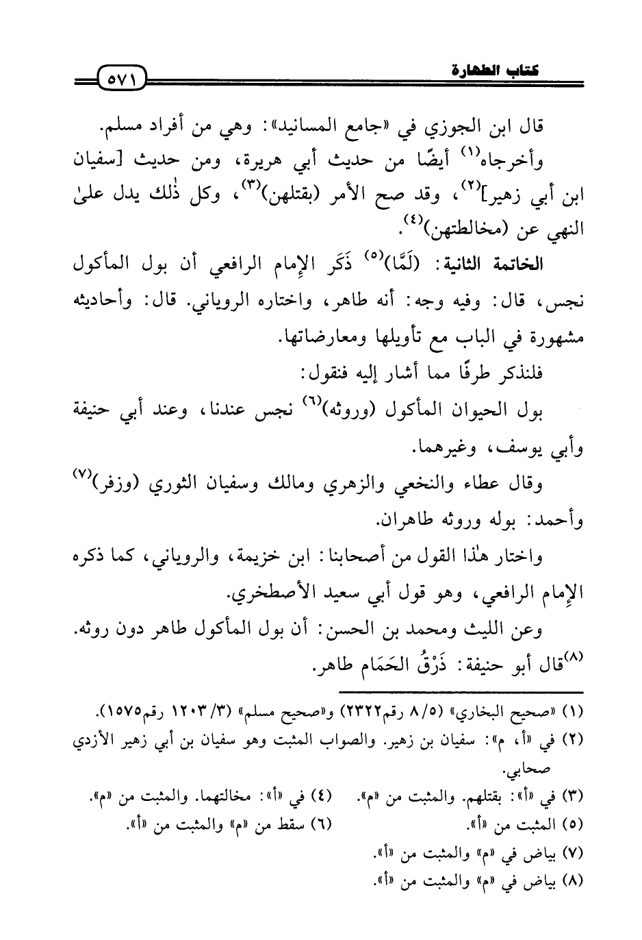 الخاتمة الثَّانِيَة: (لَمَّا) ذَكَر الإِمام الرَّافِعِيّ أَن بَوْل الْمَأْكُول نجس، قَالَ: وَفِيه وَجه: أَنه طَاهِر، وَاخْتَارَهُ الرَّوْيَانِيّ. قَالَ: وَأَحَادِيثه مَشْهُورَة فِي الْبَاب مَعَ تَأْوِيلهَا ومعارضاتها.
