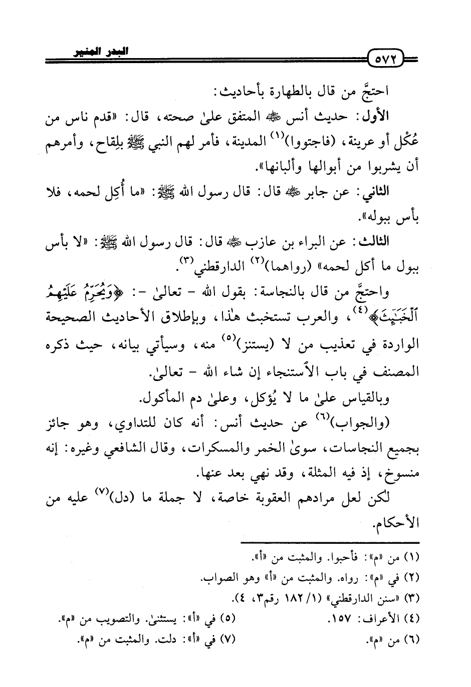واحتجَّ من قَالَ بِالنَّجَاسَةِ: بقول الله - تَعَالَى -: (وَيحرم عَلَيْهِم الْخَبَائِث) ، وَالْعرب تستخبث هَذَا، وبإطلاق الْأَحَادِيث الصَّحِيحَة الْوَارِدَة فِي تَعْذِيب من لَا (يستنز) مِنْهُ، وَسَيَأْتِي بَيَانه، حَيْثُ ذكره المُصَنّف فِي بَاب الِاسْتِنْجَاء إِن شَاءَ الله - تَعَالَى.