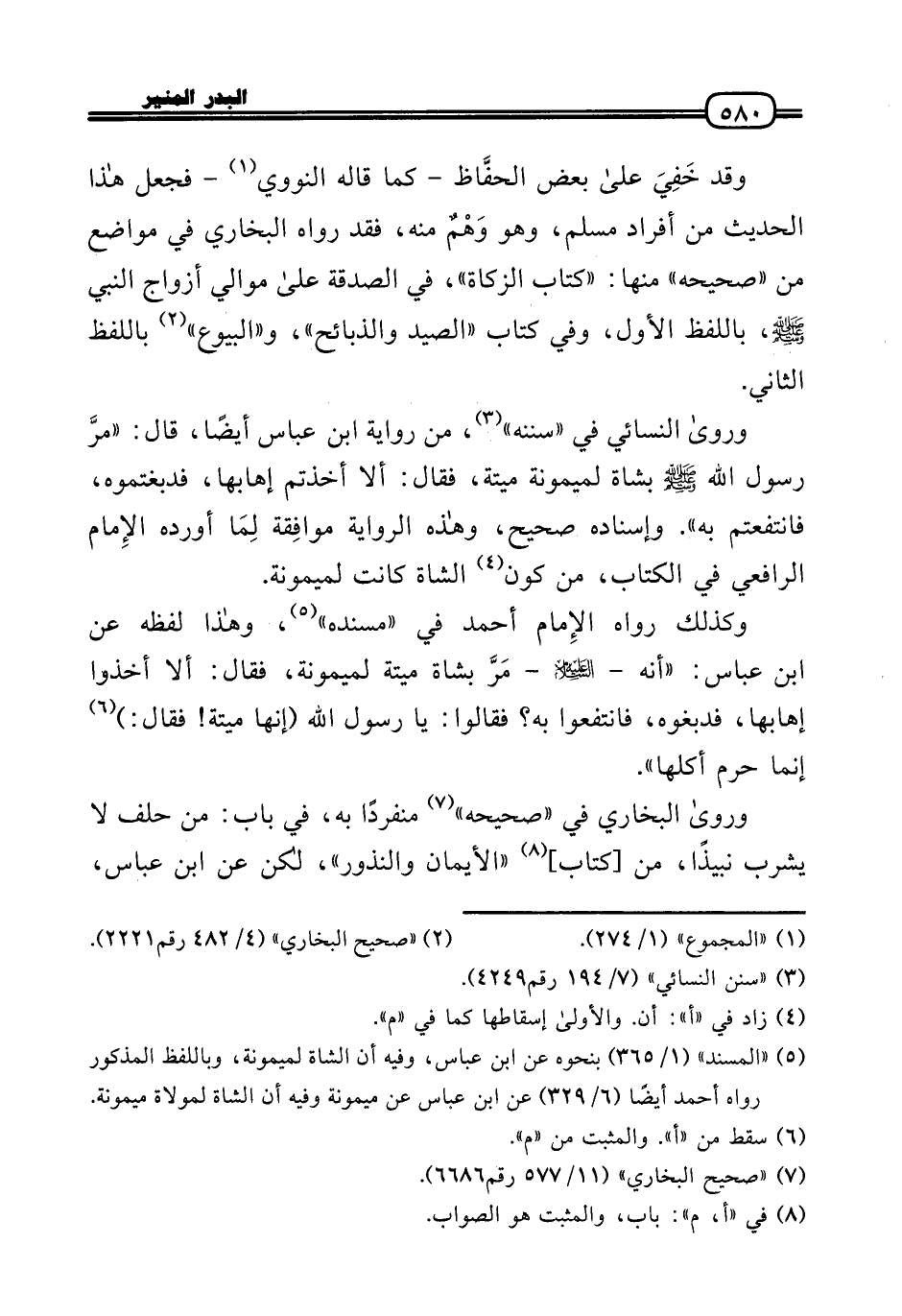 وَرَوَى النَّسَائِيّ فِي «سنَنه» ، من رِوَايَة ابْن عَبَّاس أَيْضا، قَالَ: «مرَّ رَسُول الله - صَلَّى الله عَلَيْهِ وَسلم - بِشَاة لميمونة ميتَة، فَقَالَ: أَلا أَخَذْتُم إهابها، فدبغتموه، فانتفعتم بِهِ» . وَإِسْنَاده صَحِيح، وَهَذِه الرِّوَايَة موافِقة لِمَا أوردهُ الإِمام الرَّافِعِيّ فِي الْكتاب، من كَون الشَّاة كَانَت لميمونة.