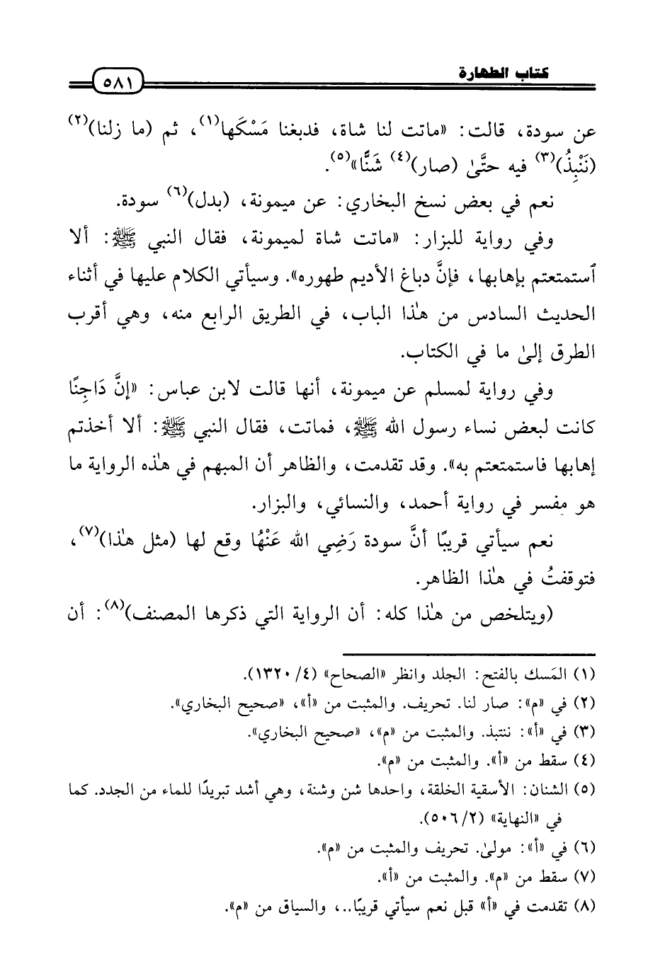 عَن سَوْدَة، قَالَت: «مَاتَت لنا شَاة، فدبغنا مَسْكَها، ثمَّ (مَا زلنا) (نَنْبِذُ) فِيهِ حتَّى (صَار) شَنًّا» .