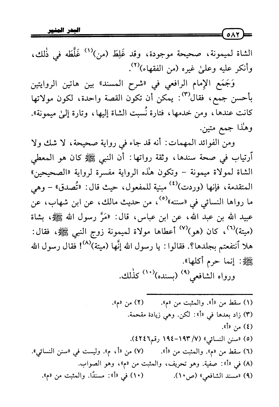 وَمن الْفَوَائِد الْمُهِمَّات: أَنه قد جَاءَ فِي رِوَايَة صَحِيحَة، لَا شكّ وَلَا ارتياب فِي صِحَة سندها، وثقة رواتها: أَن النَّبِي - صَلَّى الله عَلَيْهِ وَسلم - كَانَ هُوَ الْمُعْطِي الشَّاة لمولاة مَيْمُونَة - وَتَكون هَذِه الرِّوَايَة مفسرة لرِوَايَة «الصَّحِيحَيْنِ» الْمُتَقَدّمَة، فَإِنَّهَا (وَردت) مَبْنِيَّة للْمَفْعُول، حَيْثُ قَالَ: «تُصدق» - وَهِي مَا رَوَاهَا النَّسَائِيّ فِي «سنَنه» ، من حَدِيث مَالك، عَن ابْن شهَاب، عَن عبيد الله بن عبد الله، عَن ابْن عَبَّاس، قَالَ: «مَرَّ رَسُول الله - صَلَّى الله عَلَيْهِ وَسلم -، بِشَاة (ميتَة) ، كَانَ (هُوَ) أَعْطَاهَا مولاة لميمونة زوج النَّبِي - صَلَّى الله عَلَيْهِ وَسلم -، فَقَالَ: هلا انتفعتم بجلدها؟ . فَقَالُوا: يَا رَسُول الله إنَّها (ميتَة) ! فَقَالَ رَسُول الله - صَلَّى الله عَلَيْهِ وَسلم -: إِنَّمَا حرم أكلهَا» .