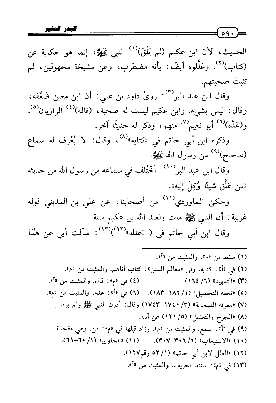 الحَدِيث، لِأَن ابْن عكيم (لم يَلْقَ) النَّبِي - صَلَّى الله عَلَيْهِ وَسلم -، إِنَّمَا هُوَ حِكَايَة عَن (كتاب) . وعَلَّلوه أَيْضا: بِأَنَّهُ مُضْطَرب، وَعَن مشيخة مجهولين، لم تثبتْ صحبتهم.