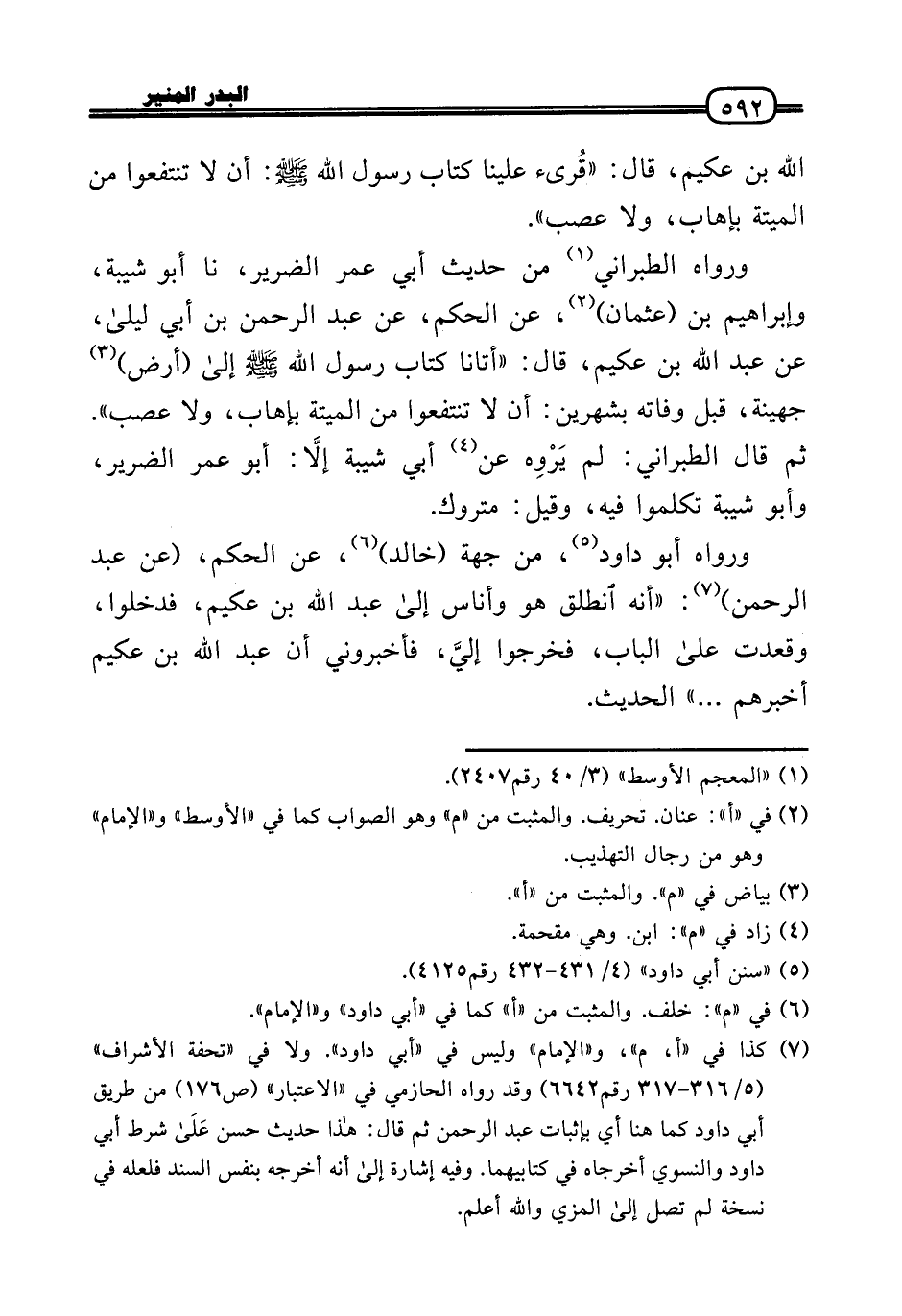 وَرَوَاهُ الطَّبَرَانِيّ من حَدِيث أبي عمر الضَّرِير، نَا أَبُو شيبَة، وَإِبْرَاهِيم بن (عُثْمَان) ، عَن الحكم، عَن عبد الرَّحْمَن بن أبي لَيْلَى، عَن عبد الله بن عكيم، قَالَ: «أَتَانَا كتاب رَسُول الله - صَلَّى الله عَلَيْهِ وَسلم - إِلَى (أَرض) جُهَيْنَة، قبل وَفَاته بشهرين: أَن لَا تنتفعوا من الْميتَة بإهاب، وَلَا عصب» . ثمَّ قَالَ الطَّبَرَانِيّ: لم يَرْوِه عَن أبي شيبَة إلاَّ: أَبُو عمر الضَّرِير، وَأَبُو شيبَة تكلمُوا فِيهِ، وَقيل: مَتْرُوك.