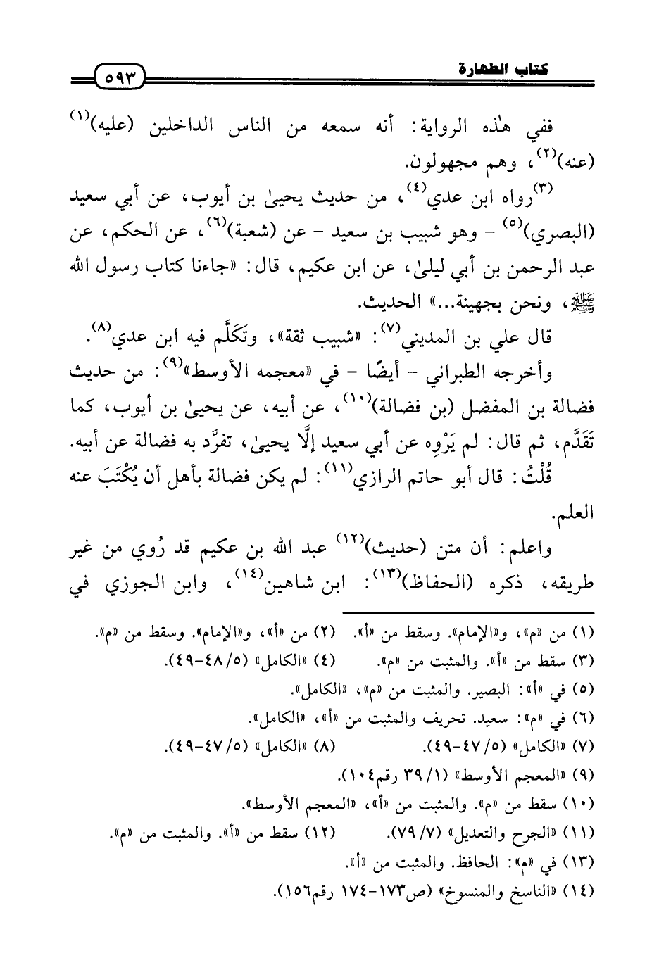 (و) رَوَاهُ ابْن عدي، من حَدِيث يَحْيَى بن أَيُّوب، عَن أبي سعيد (الْبَصْرِيّ) - وَهُوَ شبيب بن سعيد - عَن (شُعْبَة) ، عَن الحكم، عَن عبد الرَّحْمَن بن أبي لَيْلَى، عَن ابْن عكيم، قَالَ: «جَاءَنَا كتاب رَسُول الله - صَلَّى الله عَلَيْهِ وَسلم -، وَنحن بجهينة ... » الحَدِيث.
