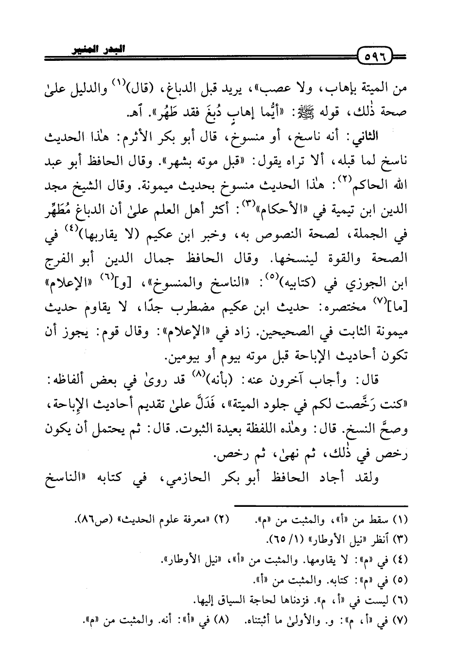 الثَّانِي: أَنه نَاسخ، أَو مَنْسُوخ، قَالَ أَبُو بكر الْأَثْرَم: هَذَا الحَدِيث نَاسخ لما قبله، أَلا ترَاهُ يَقُول: «قبل مَوته بِشَهْر» . وَقَالَ الْحَافِظ أَبُو عبد الله الْحَاكِم: هَذَا الحَدِيث مَنْسُوخ بِحَدِيث مَيْمُونَة. وَقَالَ الشَّيْخ مجد الدَّين ابْن تَيْمِية فِي «الْأَحْكَام» : أَكثر أهل الْعلم عَلَى أَن الدّباغ مُطَهِّر فِي الْجُمْلَة، لصِحَّة النُّصُوص بِهِ، وَخبر ابْن عكيم (لَا يقاربها) فِي الصِّحَّة وَالْقُوَّة لينسخها. وَقَالَ الْحَافِظ جمال الدَّين أَبُو الْفرج ابْن الْجَوْزِيّ فِي (كِتَابيه) : «النَّاسِخ والمنسوخ» ، [و] «الْإِعْلَام» [مَا] مُخْتَصره: حَدِيث ابْن عكيم مُضْطَرب جدا، لَا يُقَاوم حَدِيث مَيْمُونَة الثَّابِت فِي الصَّحِيحَيْنِ. زَاد فِي «الْإِعْلَام» : وَقَالَ قوم: يجوز أَن تكون أَحَادِيث الْإِبَاحَة قبل مَوته بِيَوْم أَو بيومين.