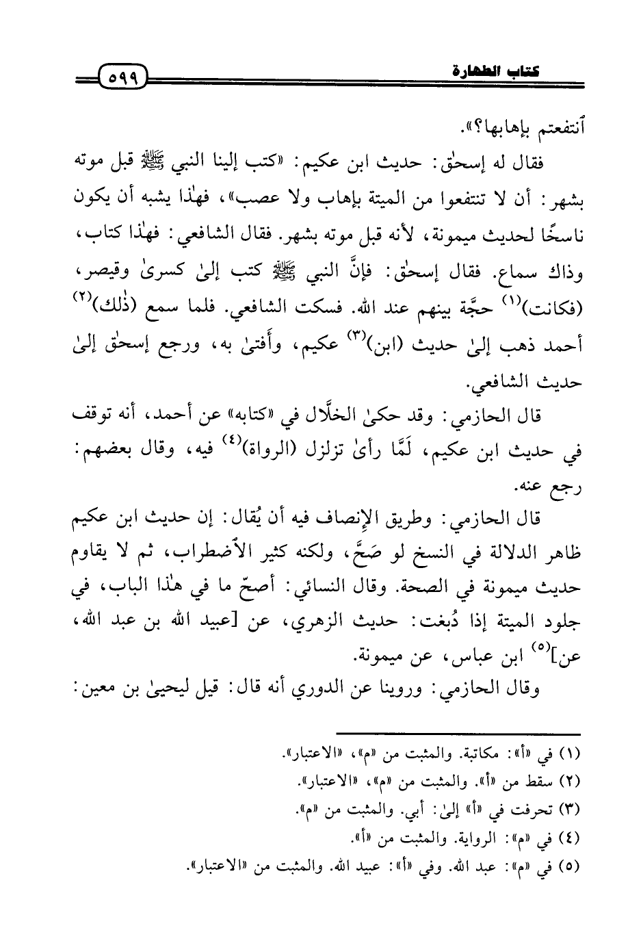 فَقَالَ لَهُ إِسْحَاق: حَدِيث ابْن عكيم: «كتب إِلَيْنَا النَّبِي - صَلَّى الله عَلَيْهِ وَسلم - قبل مَوته بِشَهْر: أَن لَا تنتفعوا من الْميتَة بإهاب وَلَا عصب» ، فَهَذَا يشبه أَن يكون نَاسِخا لحَدِيث مَيْمُونَة، لِأَنَّهُ قبل مَوته بِشَهْر. فَقَالَ الشَّافِعِي: فَهَذَا كتاب، وَذَاكَ سَماع. فَقَالَ إِسْحَاق: فإنَّ النَّبِي - صَلَّى الله عَلَيْهِ وَسلم - كتب إِلَى كسْرَى وَقَيْصَر، (فَكَانَت) حجَّة بَينهم عِنْد الله. فَسكت الشَّافِعِي. فَلَمَّا سمع (ذَلِك) أَحْمد ذهب إِلَى حَدِيث (ابْن) عكيم، وأَفتى بِهِ، وَرجع إِسْحَاق إِلَى حَدِيث الشَّافِعِي.