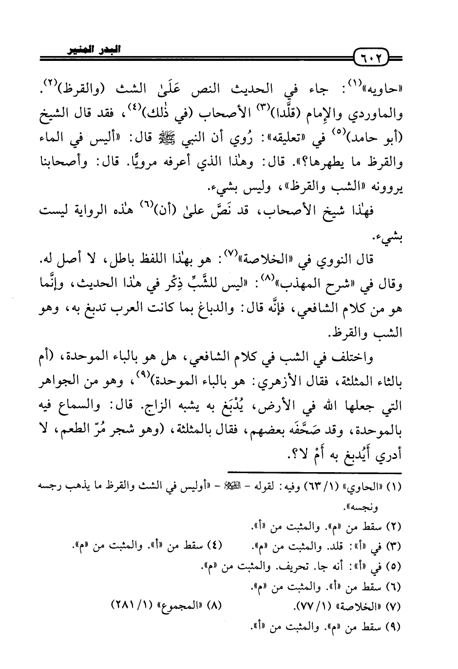 «حاويه» : جَاءَ فِي الحَدِيث النَّص عَلَى الشث (والقرظ) . وَالْمَاوَرْدِيّ والإِمام (قلَّدا) الْأَصْحَاب (فِي ذَلِك) ، فقد قَالَ الشَّيْخ (أَبُو حَامِد) فِي «تَعْلِيقه» : رُوي أَن النَّبِي - صَلَّى الله عَلَيْهِ وَسلم - قَالَ: «أَلَيْسَ فِي المَاء والقرظ مَا يطهرها؟» . قَالَ: وَهَذَا الَّذِي أعرفهُ مرويًّا. قَالَ: وأصحابنا يَرْوُونَهُ (الشب والقرظ) ، وَلَيْسَ بِشَيْء.