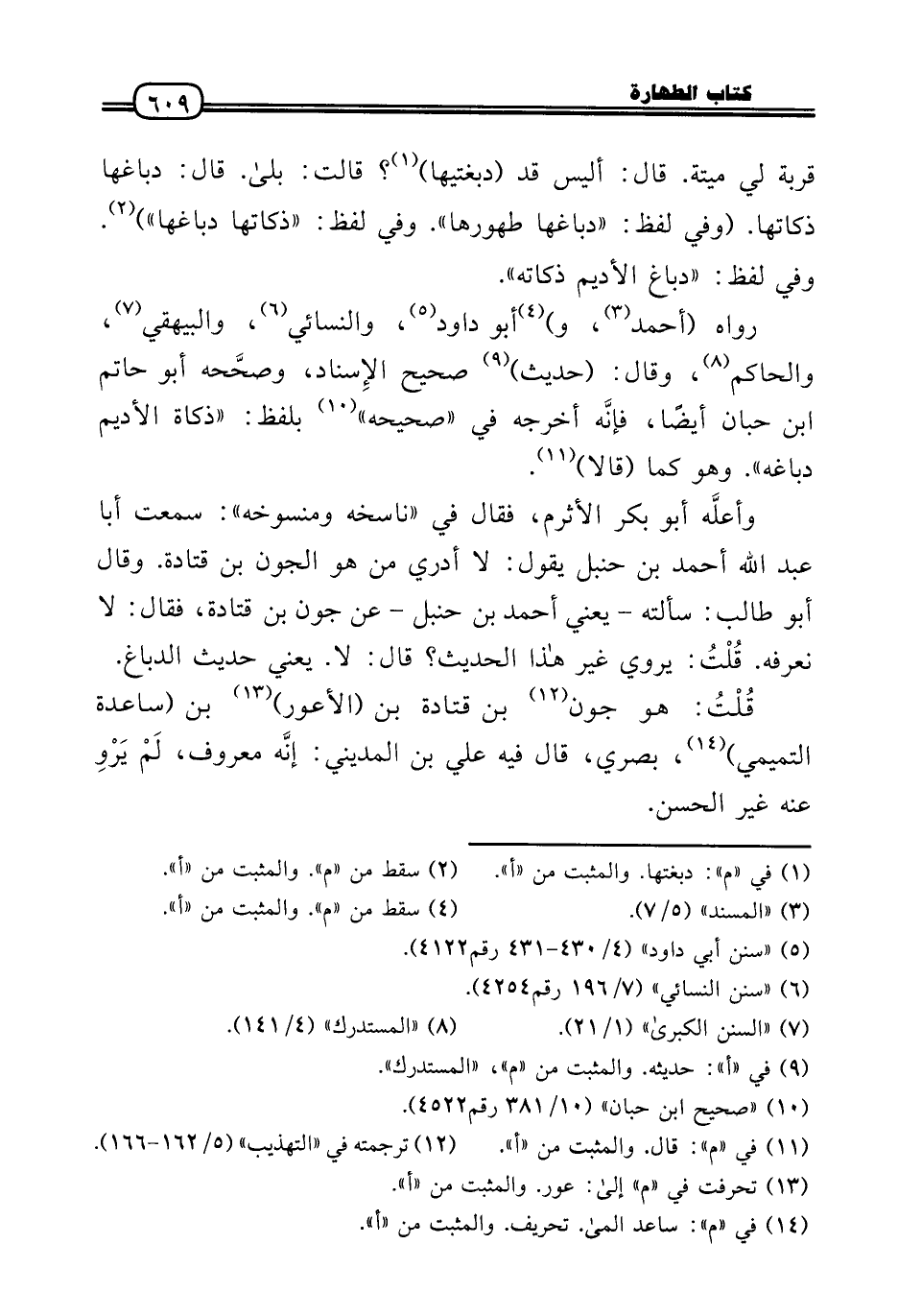 رَوَاهُ (أَحْمد، و) أَبُو دَاوُد، وَالنَّسَائِيّ، وَالْبَيْهَقِيّ، وَالْحَاكِم، وَقَالَ: (حَدِيث) صَحِيح الإِسناد، وصحَّحه أَبُو حَاتِم ابْن حبَان أَيْضا، فإنَّه أخرجه فِي «صَحِيحه» بِلَفْظ: «ذَكَاة الْأَدِيم دباغه» . وَهُوَ كَمَا (قَالَا) .