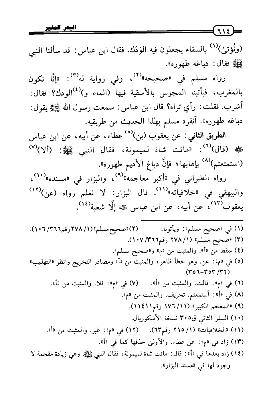 رَوَاهُ مُسلم فِي «صَحِيحه» ، وَفِي رِوَايَة لَهُ: «إنَّا نَكُون بالمغرب، فَيَأْتِينَا الْمَجُوس بالأسقية فِيهَا (المَاء و) الودك؟ فَقَالَ: اشرب. فَقلت: رَأْي ترَاهُ؟ قَالَ ابْن عَبَّاس: سَمِعت رَسُول الله - صَلَّى الله عَلَيْهِ وَسلم - يَقُول: دباغه طهوره» . انْفَرد مُسلم بِهَذَا الحَدِيث من طريقيه.