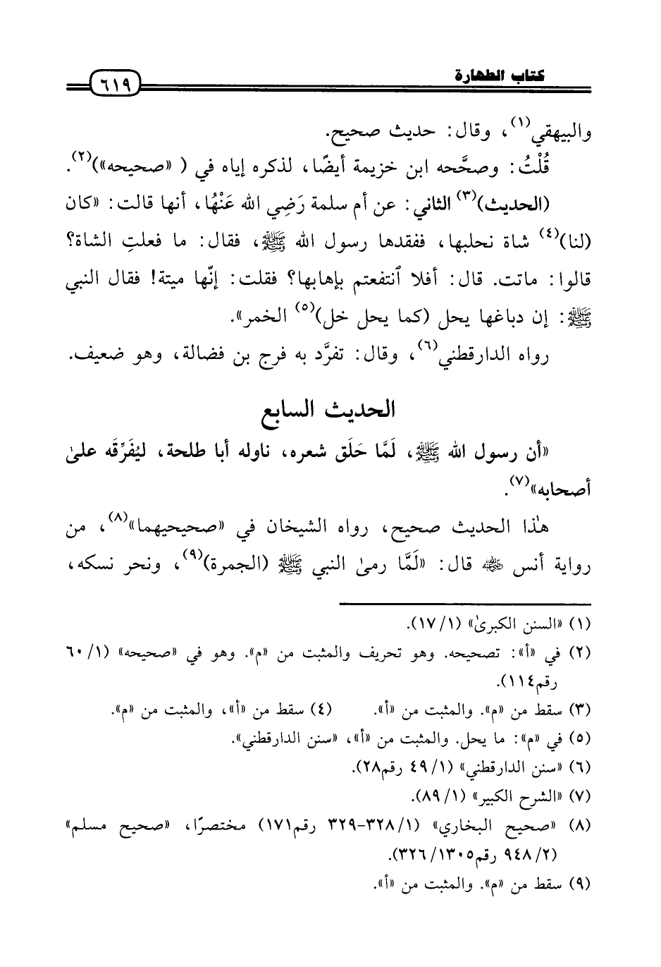 (الحَدِيث) الثَّانِي: عَن أم سَلمَة رَضِي اللهُ عَنْهُا، أَنَّهَا قَالَت: «كَانَ (لنا) شَاة نَحْلُبهَا، ففقدها رَسُول الله - صَلَّى الله عَلَيْهِ وَسلم -، فَقَالَ: مَا فعلتِ الشَّاة؟ قَالُوا: مَاتَت. قَالَ: أَفلا انتفعتم بإهابها؟ فَقلت: إنّها ميتَة! فَقَالَ النَّبِي - صَلَّى الله عَلَيْهِ وَسلم -: إِن دباغها يحل (كَمَا يحل خل) الْخمر» .