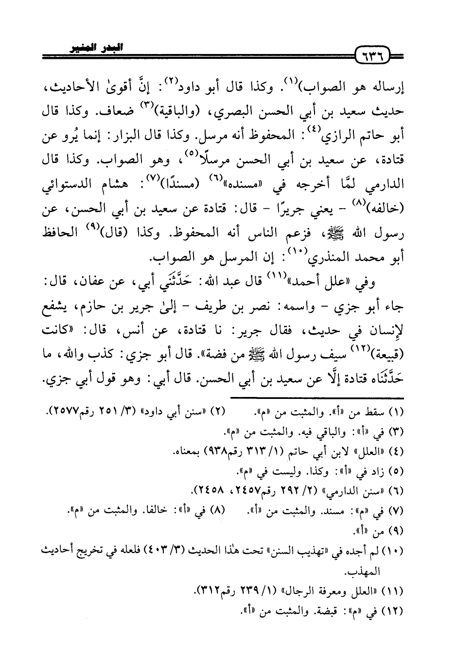إرْسَاله هُوَ الصَّوَاب) . وَكَذَا قَالَ أَبُو دَاوُد: إنَّ أَقْوَى الْأَحَادِيث، حَدِيث سعيد بن أبي الْحسن الْبَصْرِيّ، (والباقية) ضِعَاف. وَكَذَا قَالَ أَبُو حَاتِم الرَّازِيّ: الْمَحْفُوظ أَنه مُرْسل. وَكَذَا قَالَ الْبَزَّار: إِنَّمَا يُرو عَن قَتَادَة، عَن سعيد بن أبي الْحسن مُرْسلا، وَهُوَ الصَّوَاب. وَكَذَا قَالَ الدَّارمِيّ لمَّا أخرجه فِي «مُسْنده» (مُسْندًا) : هِشَام الدستوَائي (خَالفه) - يَعْنِي جَرِيرًا - قَالَ: قَتَادَة عَن سعيد بن أبي الْحسن، عَن رَسُول الله - صَلَّى الله عَلَيْهِ وَسلم -، فَزعم النَّاس أَنه الْمَحْفُوظ. وَكَذَا (قَالَ) الْحَافِظ أَبُو مُحَمَّد الْمُنْذِرِيّ: إِن الْمُرْسل هُوَ الصَّوَاب.