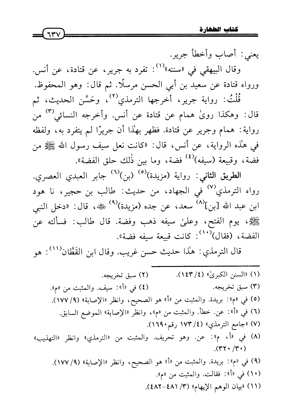 قُلْتُ: رِوَايَة جرير، أخرجهَا التِّرْمِذِيّ، وحَسَّن الحَدِيث، ثمَّ قَالَ: وَهَكَذَا رَوَى همام عَن قَتَادَة عَن أنس. وَأخرجه النَّسَائِيّ من رِوَايَة: همام وَجَرِير عَن قَتَادَة. فَظهر بِهَذَا أَن جَرِيرًا لم يتفرد بِهِ، وَلَفظه فِي هَذِه الرِّوَايَة، عَن أنس، قَالَ: «كَانَت نعل سيف رَسُول الله - صَلَّى الله عَلَيْهِ وَسلم - من فضَّة، وقبيعة (سَيْفه) فضَّة، وَمَا بَين ذَلِك حلق الْفضة» .