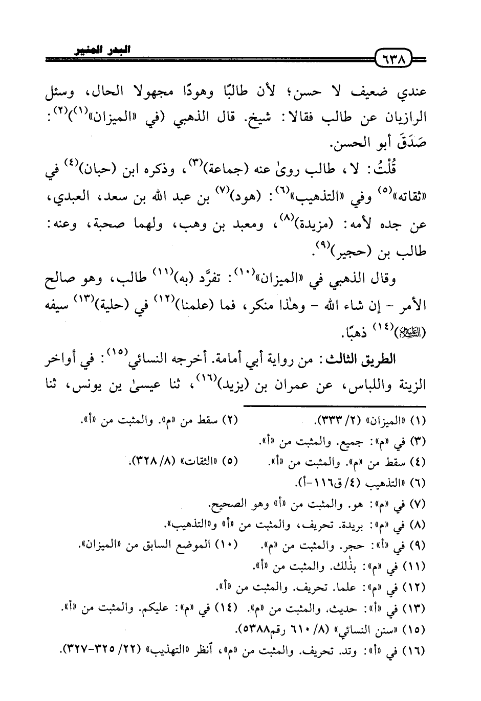 عِنْدِي ضَعِيف لَا حسن؛ لِأَن طَالبا وهودًا مَجْهُولا الْحَال، وَسُئِلَ الرازيان عَن طَالب فَقَالَا: شيخ. قَالَ الذَّهَبِيّ (فِي «الْمِيزَان» ) : صَدَقَ أَبُو الْحسن.