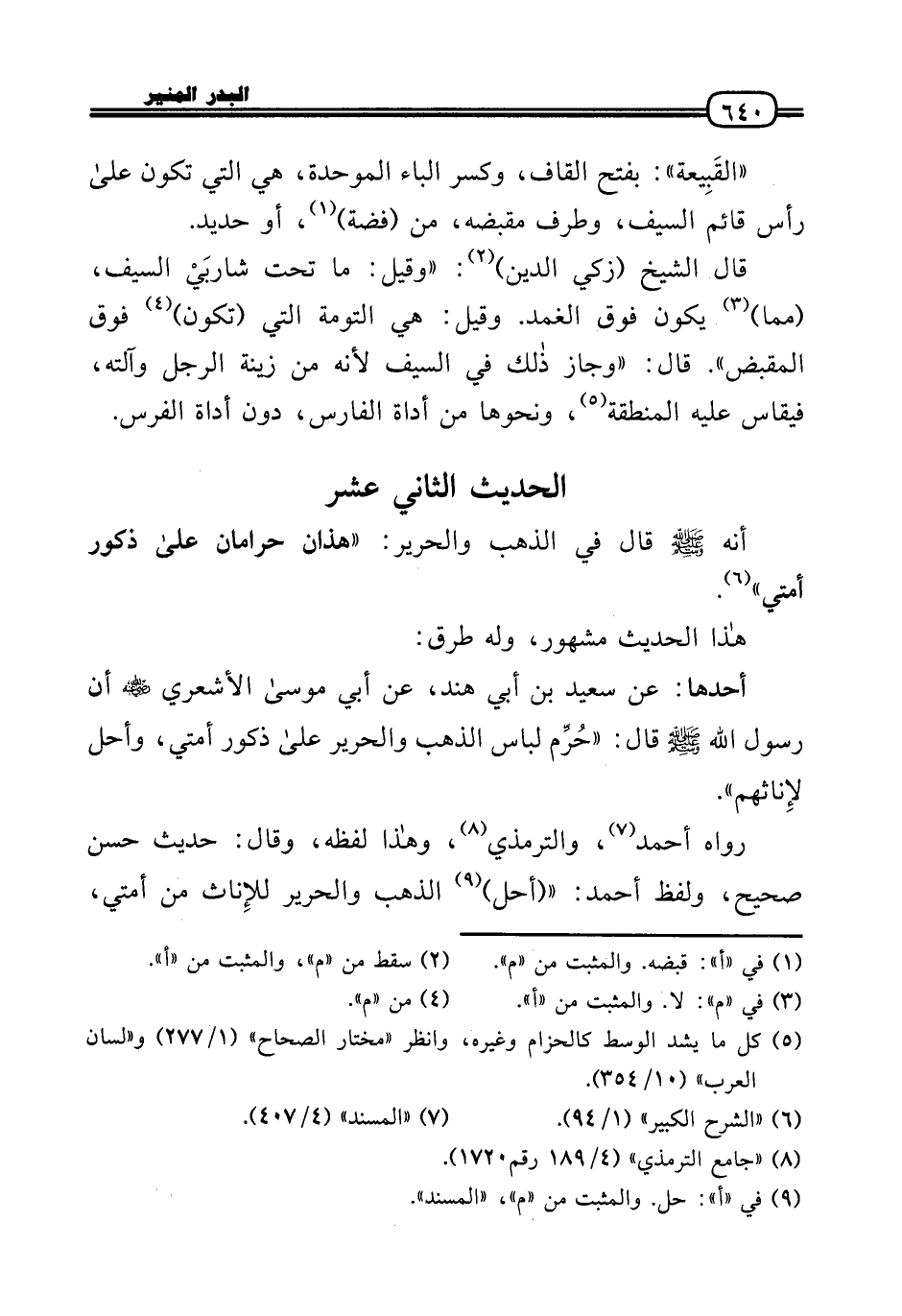 قَالَ الشَّيْخ (زكي الدَّين) : «وَقيل: مَا تَحت شاربَيْ السَّيْف، (مِمَّا) يكون فَوق الغمد. وَقيل: هِيَ التومة الَّتِي (تكون) فَوق المقبض» . قَالَ: «وَجَاز ذَلِك فِي السَّيْف لِأَنَّهُ من زِينَة الرجل وآلته، فيقاس عَلَيْهِ المنطقة، وَنَحْوهَا من أَدَاة الْفَارِس، دون أَدَاة الْفرس.