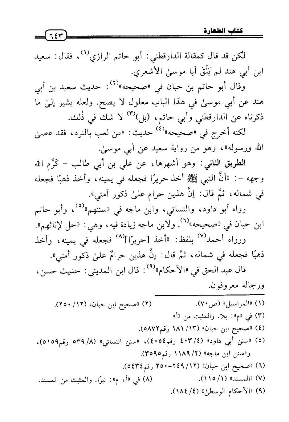 وَقَالَ أَبُو حَاتِم بن حبَان فِي «صَحِيحه» : حَدِيث سعيد بن أبي هِنْد عَن أبي مُوسَى فِي هَذَا الْبَاب مَعْلُول لَا يَصح. وَلَعَلَّه يُشِير إِلَى مَا ذَكرْنَاهُ عَن الدَّارَقُطْنِيّ وَأبي حَاتِم، (بل) لَا شكّ فِي ذَلِك.