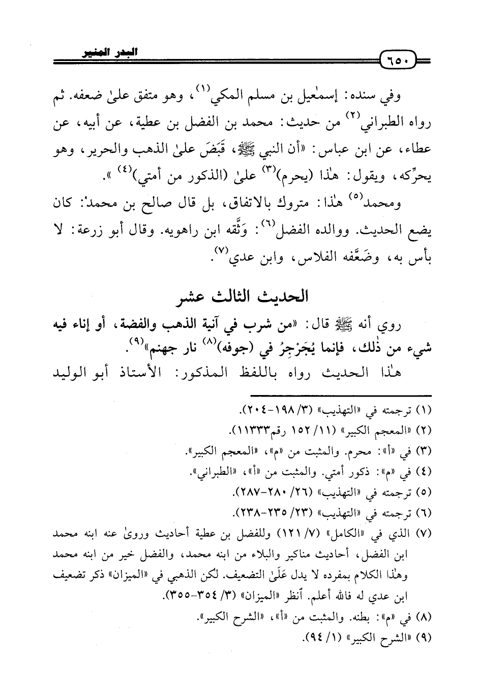 وَفِي سَنَده: إِسْمَاعِيل بن مُسلم الْمَكِّيّ، وَهُوَ مُتَّفق عَلَى ضعفه. ثمَّ رَوَاهُ الطَّبَرَانِيّ من حَدِيث: مُحَمَّد بن الْفضل بن عَطِيَّة، عَن أَبِيه، عَن عَطاء، عَن ابْن عَبَّاس: «أَن النَّبِي - صَلَّى الله عَلَيْهِ وَسلم -، قَبَضَ عَلَى الذَّهَب وَالْحَرِير، وَهُوَ يحرِّكه، وَيَقُول: هَذَا (يحرم) عَلَى (الذُّكُور من أمتِي) » .