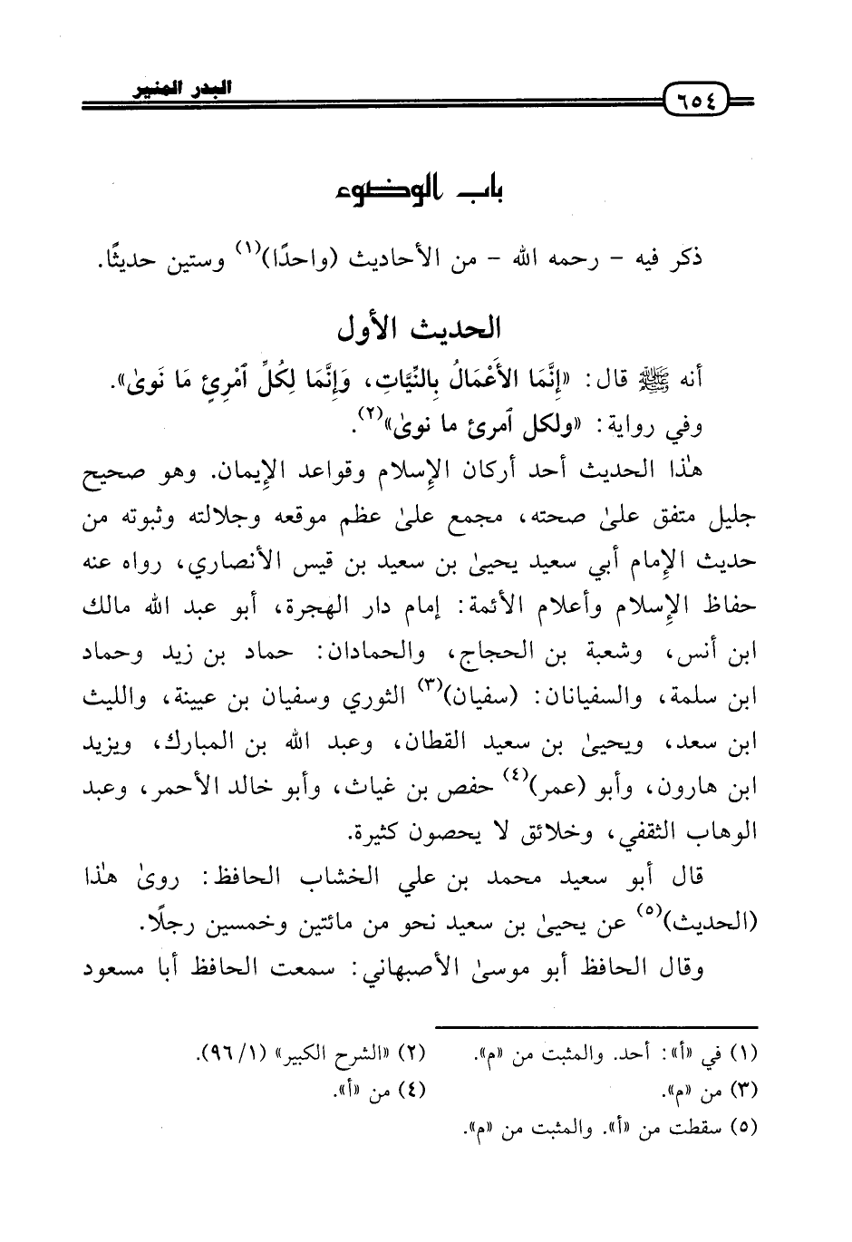 هَذَا الحَدِيث أحد أَرْكَان الإِسلام وقواعد الإِيمان. وَهُوَ صَحِيح جليل مُتَّفق عَلَى صِحَّته، مجمع عَلَى عظم موقعه وجلالته وثبوته من حَدِيث الإِمام أبي سعيد يَحْيَى بن سعيد بن قيس الْأنْصَارِيّ، رَوَاهُ عَنهُ حفاظ الإِسلام وأعلام الْأَئِمَّة: إِمَام دَار الْهِجْرَة، أَبُو عبد الله مَالك بن أنس، وَشعْبَة بن الْحجَّاج، والحمادان: حَمَّاد بن زيد وَحَمَّاد بن سَلمَة، والسفيانان: (سُفْيَان) الثَّوْريّ وسُفْيَان بن عُيَيْنَة، وَاللَّيْث بن سعد، وَيَحْيَى بن سعيد الْقطَّان، وَعبد الله بن الْمُبَارك، وَيزِيد بن هَارُون، وَأَبُو (عمر) حَفْص بن غياث، وَأَبُو خَالِد الْأَحْمَر، وَعبد الْوَهَّاب الثَّقَفِيّ، وخلائق لَا يُحصونَ كَثِيرَة.