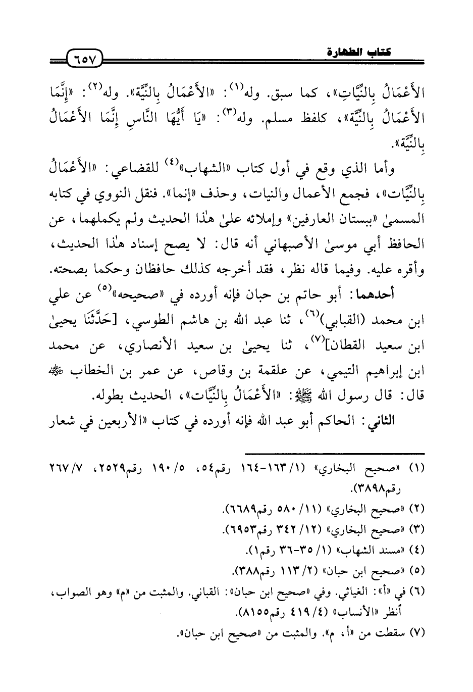 أَحدهمَا: أَبُو حَاتِم بن حبَان فَإِنَّهُ أوردهُ فِي «صَحِيحه» عَن عَلّي بن مُحَمَّد (القبابي) ، ثَنَا عبد الله بن هَاشم الطوسي، [حَدَّثَنَا يَحْيَى بن سعيد الْقطَّان] ، ثَنَا يَحْيَى بن سعيد الْأنْصَارِيّ، عَن مُحَمَّد بن إِبْرَاهِيم التَّيْمِيّ، عَن عَلْقَمَة بن وَقاص، عَن عمر بن الْخطاب رَضِيَ اللَّهُ عَنْه قَالَ: قَالَ رَسُول الله - صَلَّى الله عَلَيْهِ وَسلم -: «الأَعْمَالُ بِالنِّيَّات» ، الحَدِيث بِطُولِهِ.