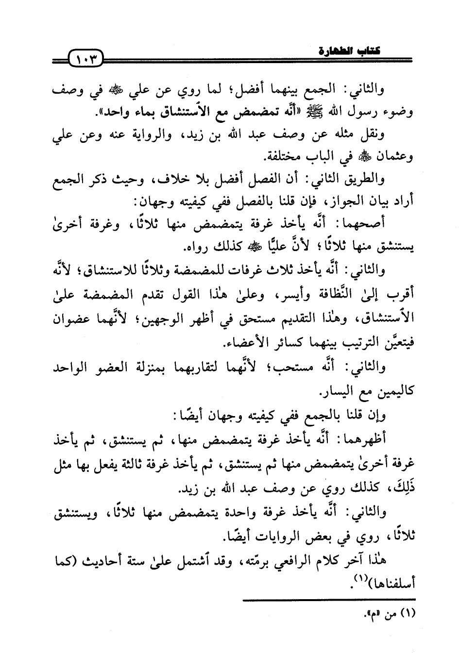 وَالثَّانِي: الْجمع بَينهمَا أفضل؛ لما رُوِيَ عَن عَلّي رَضِيَ اللَّهُ عَنْه فِي وصف وضوء رَسُول الله - صَلَّى الله عَلَيْهِ وَسلم - «أنَّه تمضمض مَعَ الِاسْتِنْشَاق بِمَاء وَاحِد» .