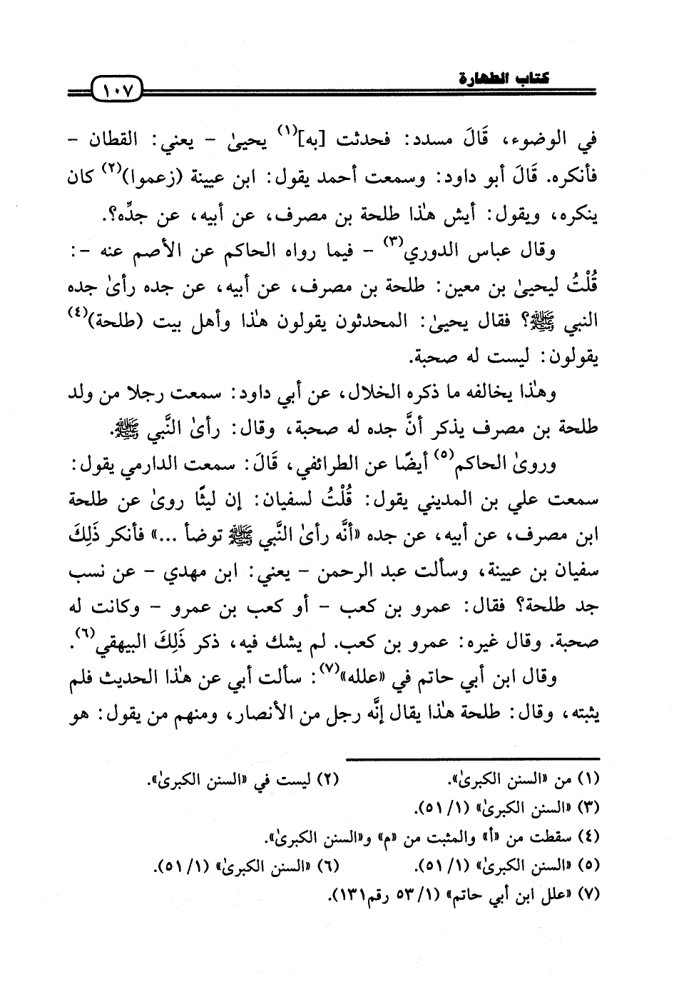 فِي الْوضُوء، قَالَ مُسَدّد: فَحدثت [بِهِ] يَحْيَى - يَعْنِي: الْقطَّان - فَأنكرهُ. قَالَ أَبُو دَاوُد: وَسمعت أَحْمد يَقُول: ابْن عُيَيْنَة (زَعَمُوا) كَانَ يُنكره، وَيَقُول: أيش هَذَا طَلْحَة بن مصرف، عَن أَبِيه، عَن جدِّه؟ .