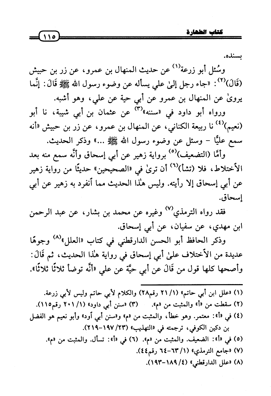 وَذكر الْحَافِظ أَبُو الْحسن الدَّارَقُطْنِيّ فِي كتاب «الْعِلَل» وُجُوهًا عديدة من الِاخْتِلَاف عَلَى أبي إِسْحَاق فِي رِوَايَة هَذَا الحَدِيث، ثمَّ قَالَ: وأصحها كلهَا قَول من قَالَ عَن أبي حيَّة عَن عَلّي «أنَّه تَوَضَّأ ثَلَاثًا ثَلَاثًا» .