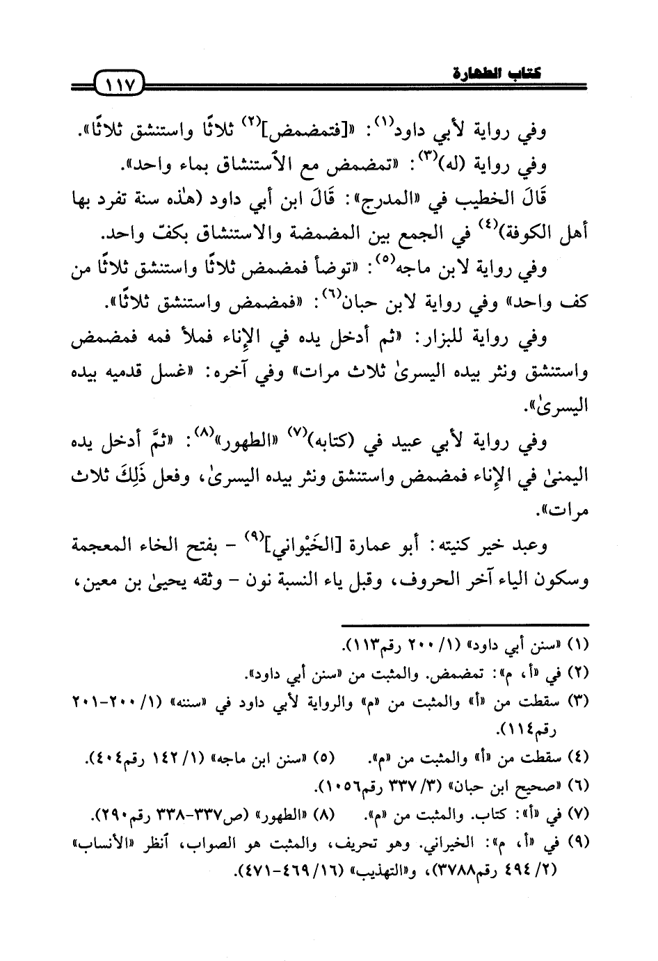 وَفِي رِوَايَة لأبي عبيد فِي (كِتَابه) «الطّهُور» : «ثمَّ أَدخل يَده الْيُمْنَى فِي الإِناء فَمَضْمض واستنشق ونثر بِيَدِهِ الْيُسْرَى، وَفعل ذَلِكَ ثَلَاث مَرَّات» .