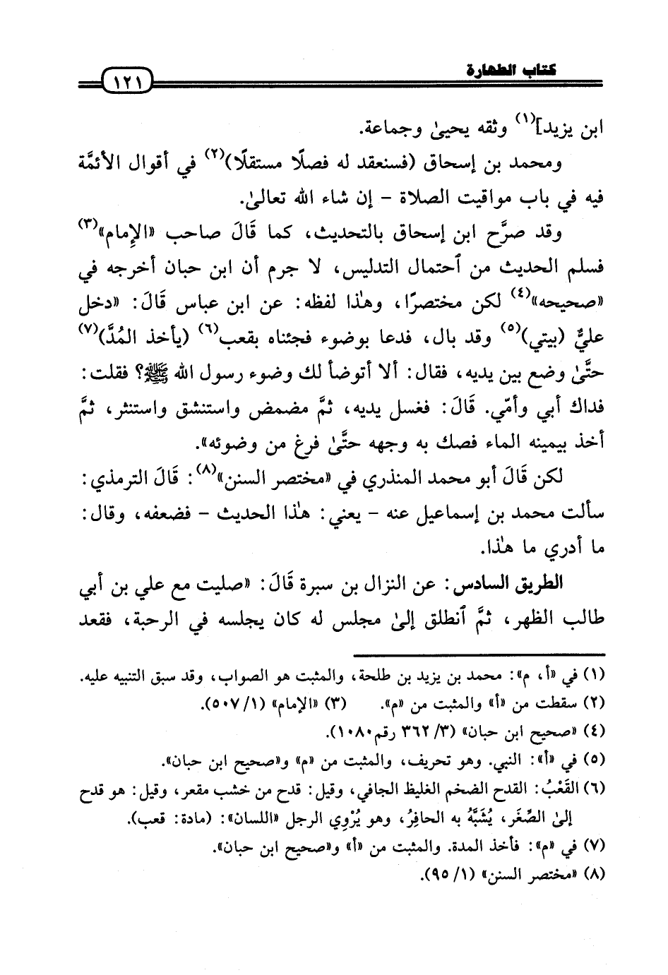 وَقد صرَّح ابْن إِسْحَاق بِالتَّحْدِيثِ، كَمَا قَالَ صَاحب «الإِمام» فَسلم الحَدِيث من احْتِمَال التَّدْلِيس، لَا جرم أَن ابْن حبَان أخرجه فِي «صَحِيحه» لَكِن مُخْتَصرا، وَهَذَا لَفظه: عَن ابْن عَبَّاس قَالَ: «دخل عليٌّ (بَيْتِي) وَقد بَال، فَدَعَا بِوضُوء فجئناه بِقَعْبٍ (يَأْخُذ المُدَّ) حتَّى وضع بَين يَدَيْهِ، فَقَالَ: أَلا أتوضأ لَك وضوء رَسُول الله - صَلَّى الله عَلَيْهِ وَسلم -؟ فَقلت: فدَاك أبي وأمّي. قَالَ: فَغسل يَدَيْهِ، ثمَّ مضمض واستنشق واستنثر، ثمَّ أَخذ بِيَمِينِهِ المَاء فصك بِهِ وَجهه حتَّى فرغ من وضوئِهِ» .