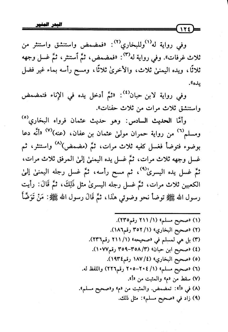 وأمَّا الحَدِيث السَّادِس: وَهُوَ حَدِيث عُثْمَان فَرَوَاهُ البُخَارِيّ وَمُسلم من رِوَايَة حمْرَان مولَى عُثْمَان بن عَفَّان، (عَنهُ) «أنَّه دَعَا بِوضُوء فَتَوَضَّأ فَغسل كفيه ثَلَاث مَرَّات، ثمَّ (مضمض) واستنثر، ثمَّ غسل وَجهه ثَلَاث مَرَّات، ثمَّ غسل يَده الْيُمْنَى إِلَى الْمرْفق ثَلَاث مَرَّات، ثمَّ غسل يَده الْيُسْرَى، ثمَّ مسح رَأسه، ثمَّ غسل رجله الْيُمْنَى إِلَى الْكَعْبَيْنِ ثَلَاث مَرَّات، ثمَّ غسل رجله الْيُسْرَى مثل ذَلِكَ، ثمَّ قَالَ: رَأَيْت رَسُول الله - صَلَّى الله عَلَيْهِ وَسلم - تَوَضَّأ نَحْو وضوئي هَذَا، ثمَّ قَالَ رَسُول الله - صَلَّى الله عَلَيْهِ وَسلم -: مَنْ تَوَضَّأَ
