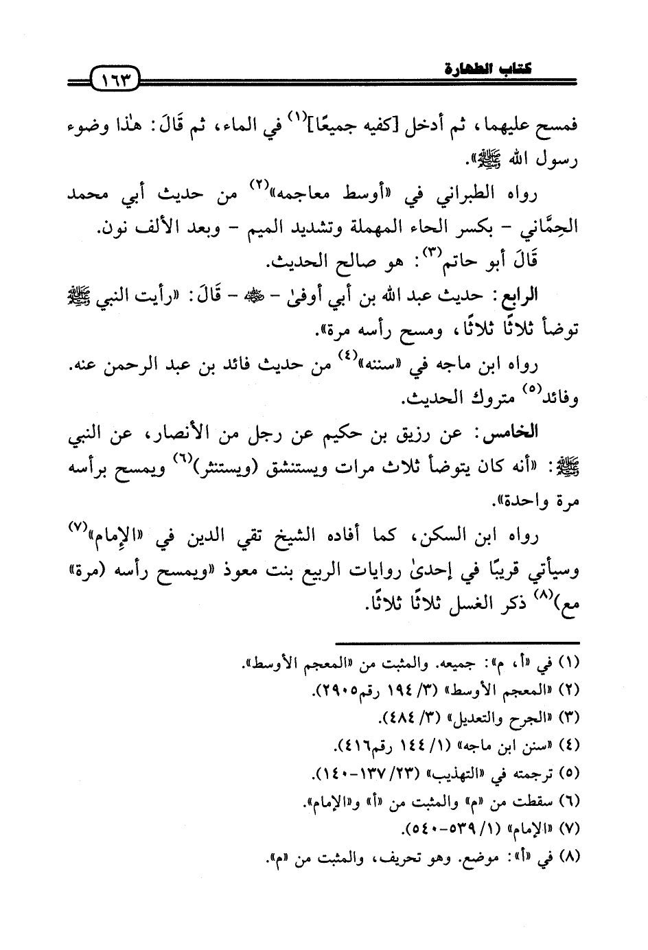 الرَّابِع: حَدِيث عبد الله بن أبي أَوْفَى - رَضي اللهُ عَنهُ - قَالَ: «رَأَيْت النَّبِي - صَلَّى الله عَلَيْهِ وَسلم - تَوَضَّأ ثَلَاثًا ثَلَاثًا، وَمسح رَأسه مرّة» .