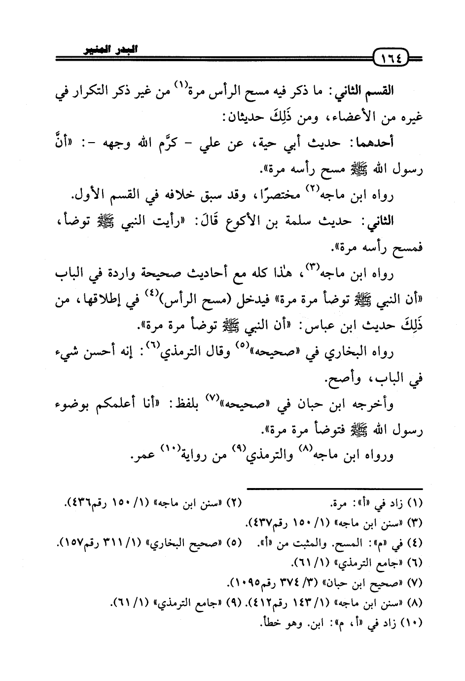 الْقسم الثَّانِي: مَا ذكر فِيهِ مسح الرَّأْس مرّة من غير ذكر التّكْرَار فِي غَيره من الْأَعْضَاء، وَمن ذَلِكَ حديثان:
